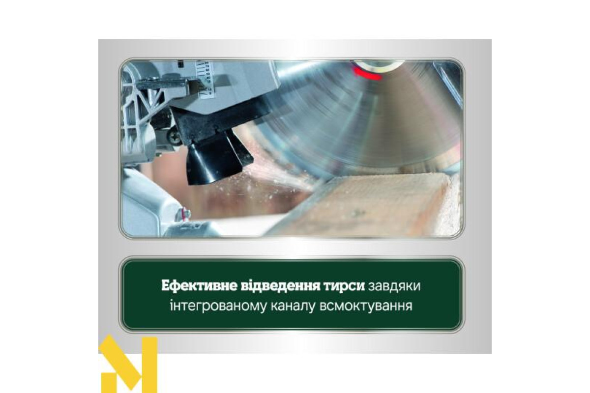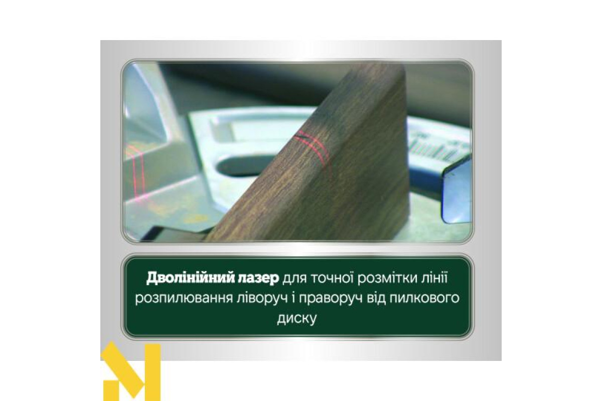- Подвійний лазер чітко маркує лінію різу, а яскраве підсвічування робочої зони дозволяє працювати при поганому освітленні.