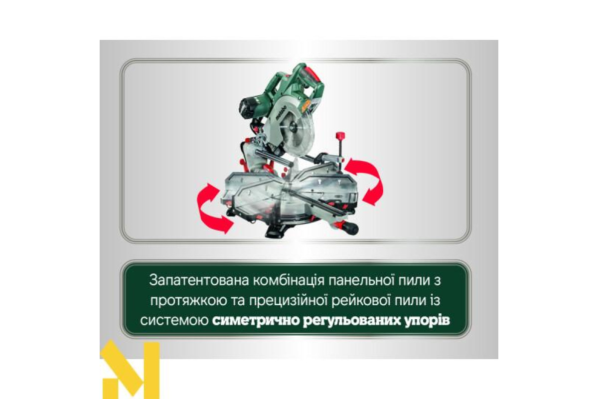 Пила торцювання Metabo KGSV 72 Xact Sym унікальний інструмент, в якому класична функціональність професійної пили торцювання з протяжкою доповнена ефективною системою симетрично встановлюючих упорів.