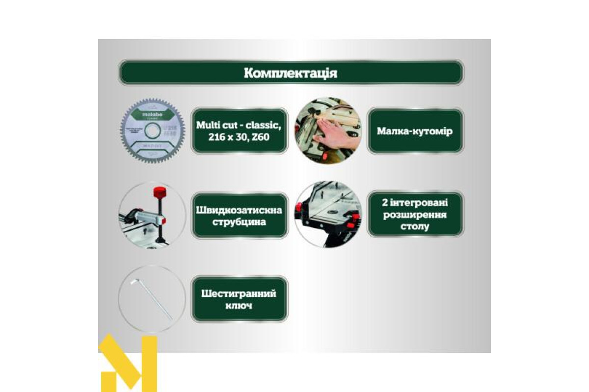 - Пильний диск: 216 мм х 30 мм