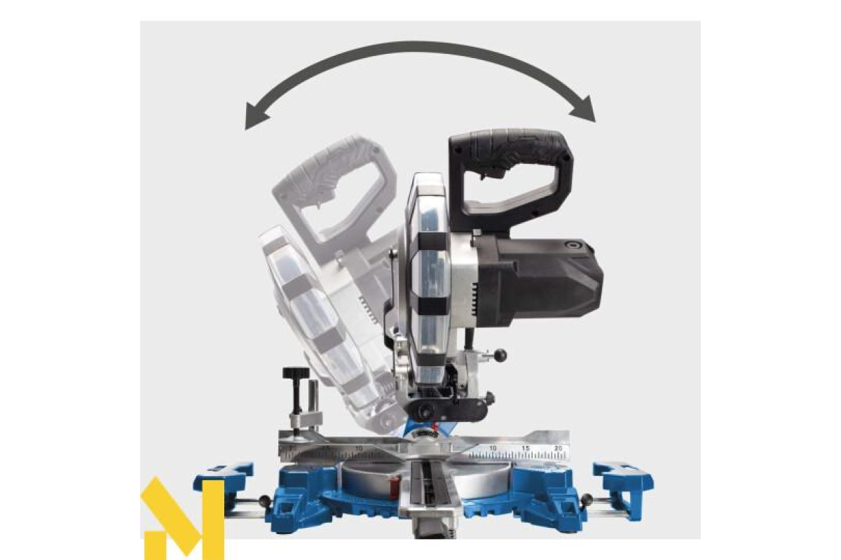 Поворотний стіл має діапазон повороту від -45° до +45°. Кут нахилу можна легко регулювати від 0 до 45° за допомогою точок фіксації. Пильне полотно також можна нахиляти до 45° ліворуч для косих розпилів. Практичний пилозбірник збирає дрібний пил, що утворюється, забезпечуючи чисте робоче місце.