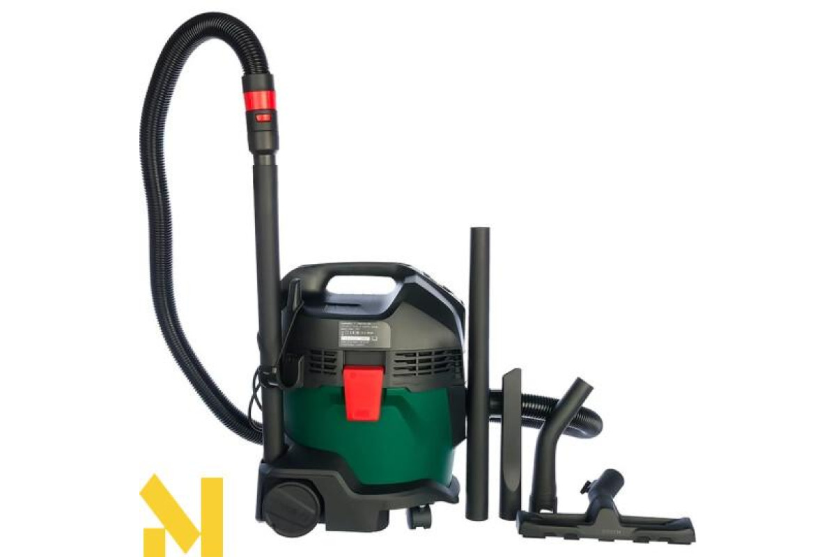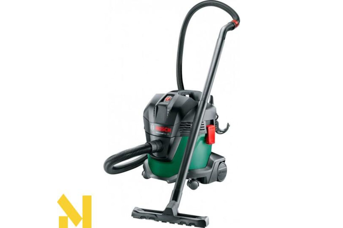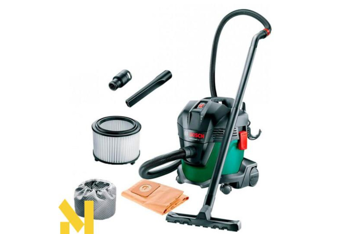 Універсальний пилосос Bosch UniversalVac 15 виробляє повітряний потік до 65 л/с з розрядженням 240 мбар. Потужний двигун 1000 Вт відмінно впорається із забезпеченням тривалої роботи. Ємний 15-літровий резервуар оснащений датчиком наповненості, і забезпечить своєчасне відключення під час збирання рідини. У комплект входять дві насадки, пара трубок для пиловідведення, шланг 2,2 м, гумова кромка, мішок з паперу.