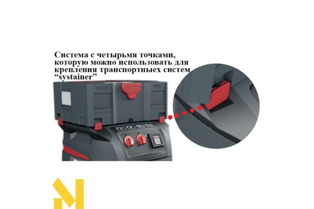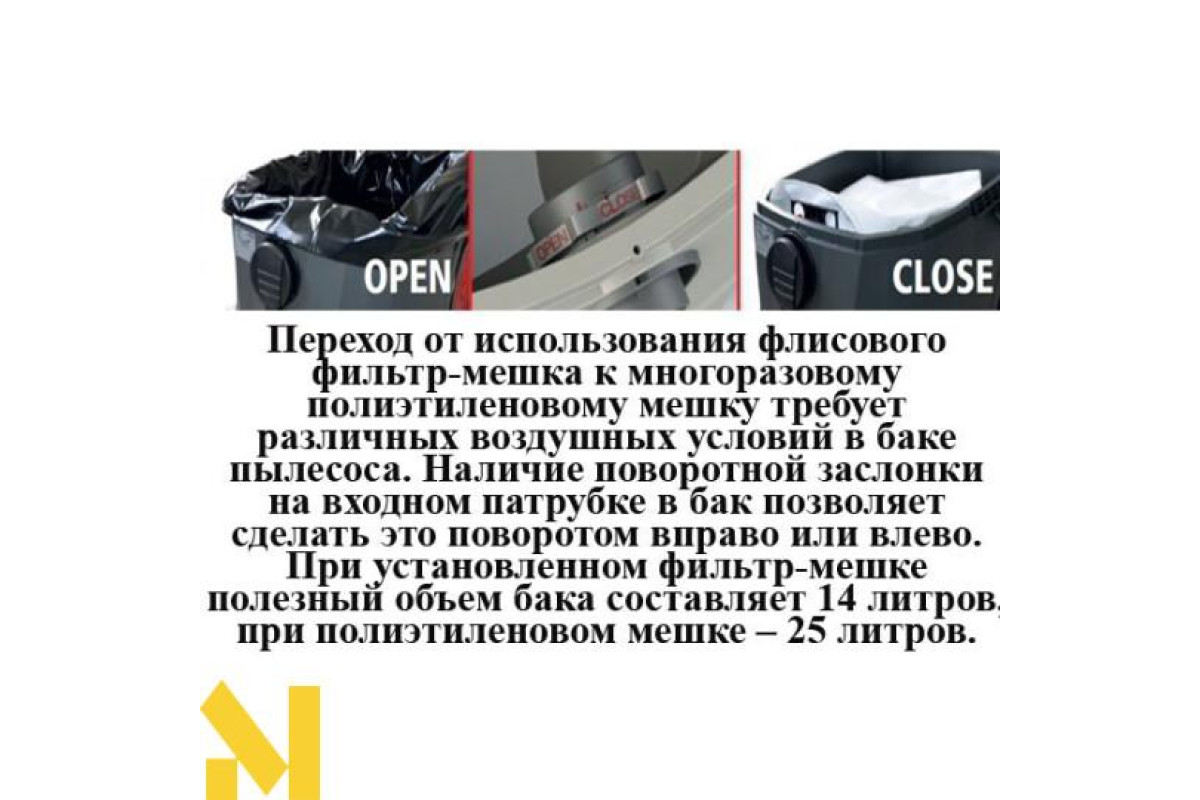 Пилосос оснащується фільтрами класу "М", а також ефективною автоматичною системою їх очищення, що дозволяє використовувати його без пиловловлювальних мішків навіть при роботі в найскладніших умовах. Великий бак вміщує в собі 25 л сухого бруду або 22 л рідкого бруду (води).