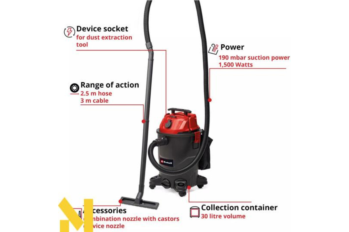 Пилосос Einhell для вологого/сухого прибирання TC-VC 1930 A не тільки вражає потужністю 1500 Вт, але також може використовуватися на будь-якому будівельному майданчику. Незалежно від того, вологий чи сухий: із потужністю всмоктування 190 мбар це оптимальна підтримка для будь-якої роботи.