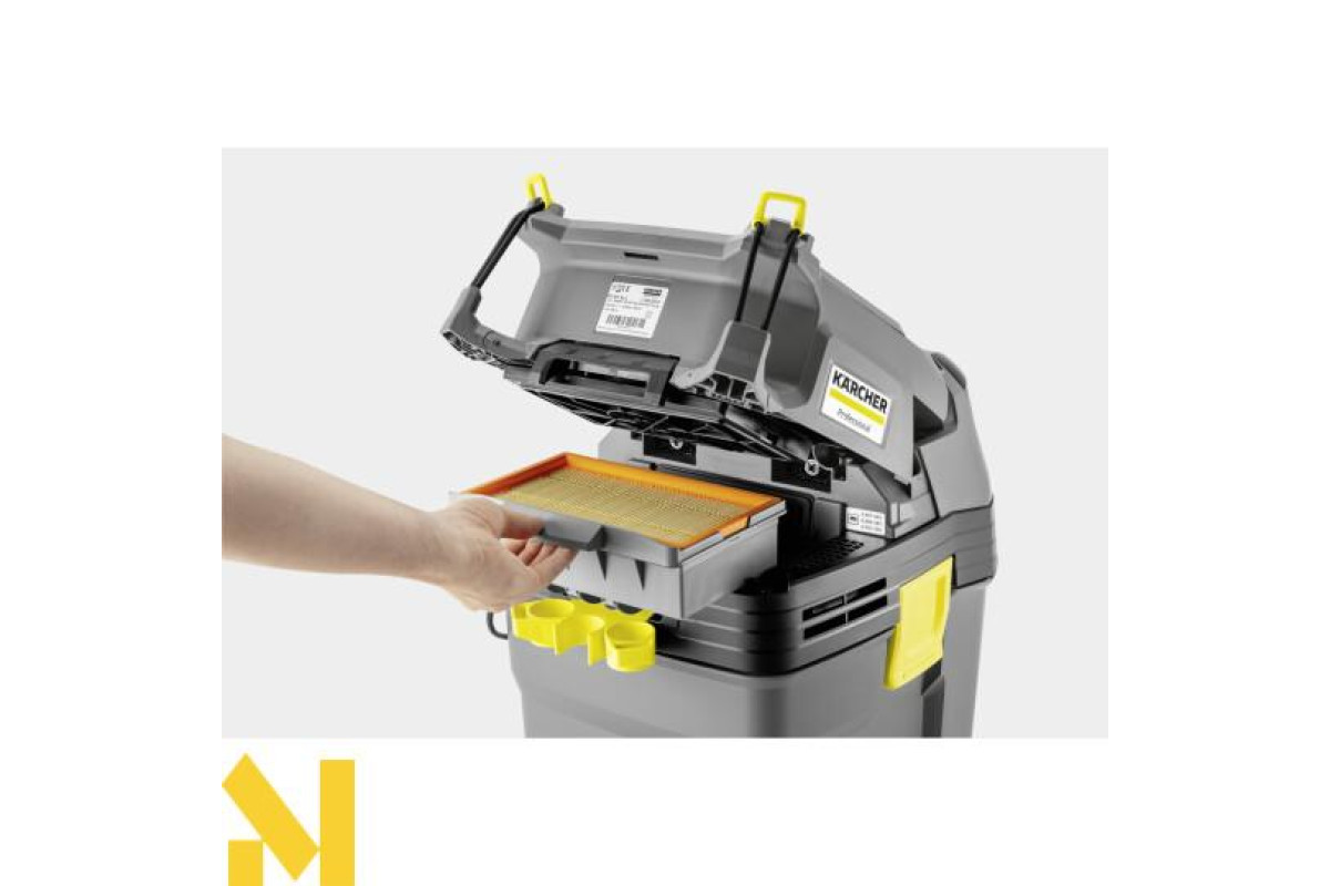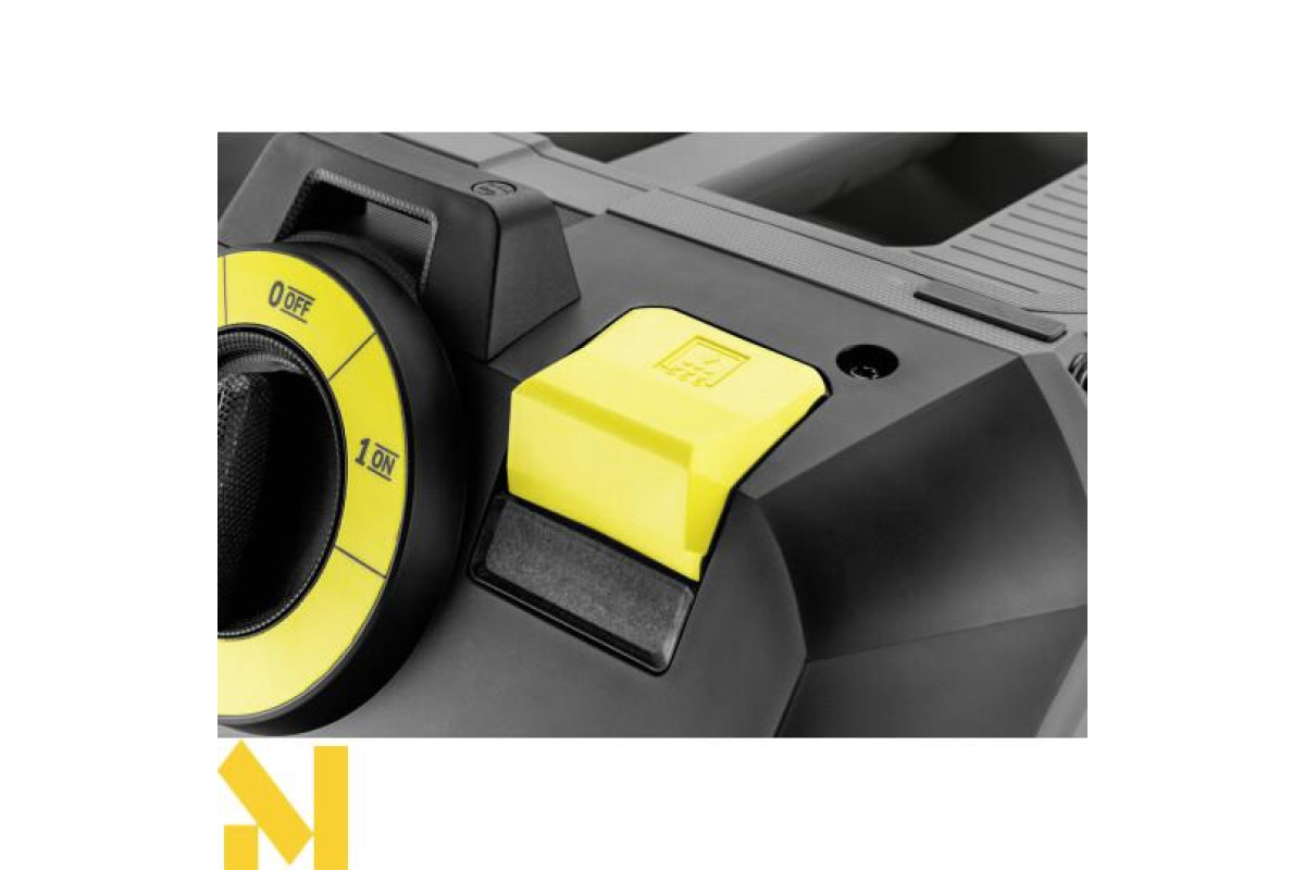 Крім ефективної напівавтоматичної системи очищення фільтра, наш компактний пилосос для вологого та сухого прибирання NT 30/1 Ap Te L має інтегровану автоматичну штепсельну розетку для роботи з електроінструментом. Чудова сила всмоктування робить його здатним видаляти забруднення різних видів: для збирання після проведення будівельних робіт, для очищення салону автомобіля, для збирання рідин, для очищення обладнання та систем. Навіть середню кількість дрібного пилу можна зібрати без використання фільтр-мішка. Усі перемикачі знаходяться на головній панелі. Крім того, апарат має продумані деталі для зберігання аксесуарів. Плоска верхня частина дозволяє розмістити на ній ящик з інструментами, а за допомогою спеціального пристрою він може бути зафіксований.