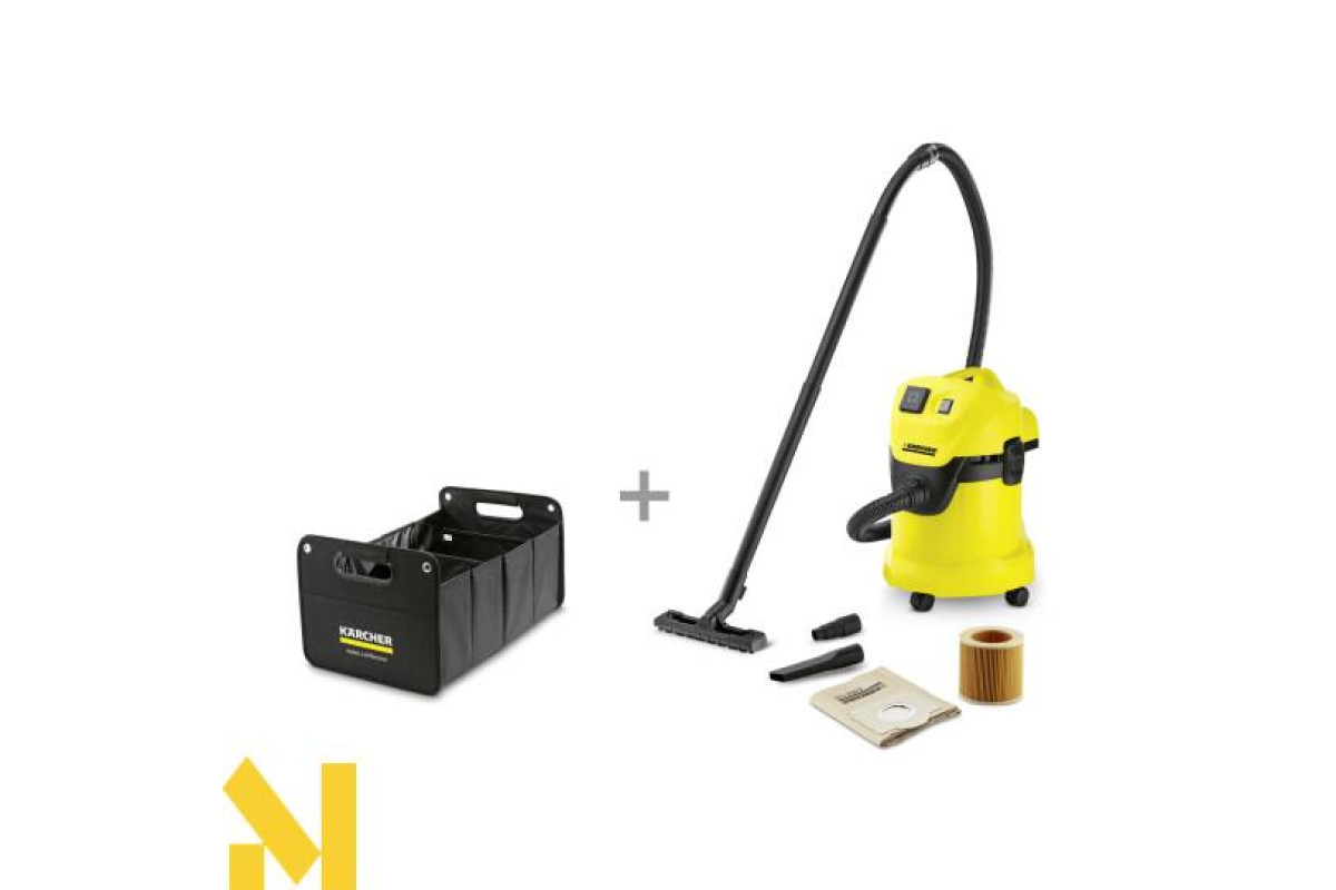 Пилосос WD 3 Р - ідеальний апарат початкового класу вдосконаленого покоління господарських пилососів Kärcher. Споживаючи всього 1000 Вт, він демонструє потужність всмоктування, аналогічну пилососів зі споживанням 1400 Вт. 17-літровий контейнер дозволяє легко і швидко збирати як великий сухе сміття, так і вологу. Апарат оснащений двома подовжувальними трубками, для підлоги насадкою для вологого і сухого прибирання, патронним фільтром і паперовим фільтр-мішком. Має функцію видування, місце для зберігання кабелю, місце для зберігання аксесуарів і зручну ручку. Додатково оснащений вбудованою розеткою, що дозволяє підключити до нього безпосередньо електроінструмент (також в комплекті йде спеціальний перехідник). Ідеальний помічник для використання в приміщенні і на відкритому повітрі.