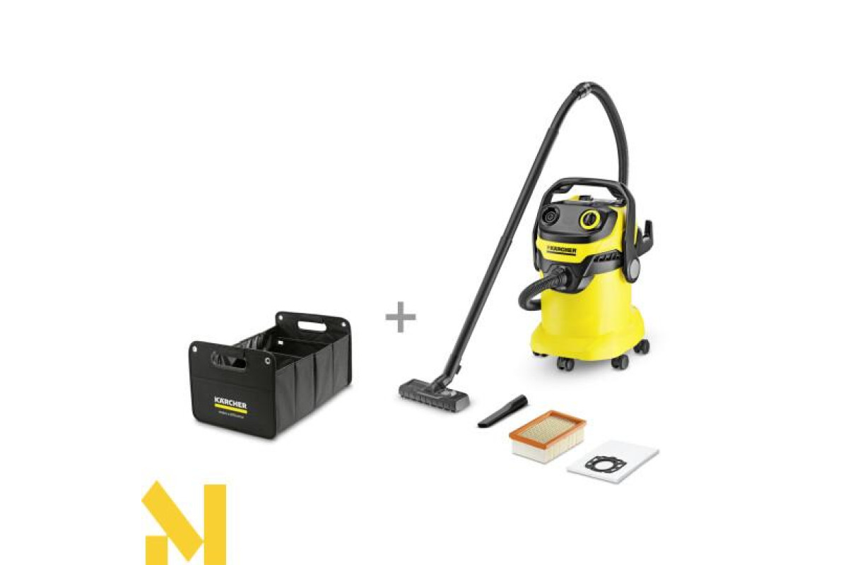 Пилосос WD 5 - модель середнього класу вдосконаленого покоління господарських пилососів Kärcher - ідеальний варіант для прибирання великих площ. Висока сила всмоктування при споживанні всього 1100 Вт. Має контейнер ємністю 25 л, що дозволяє збирати великий обсяг рідини або сміття. Зручна конструкція системи фільтрації дозволяє зняти і отрусіть фільтр без найменшого дотику до нього руками: касетник з фільтром розташований зовні і легко знімається однією рукою (не потрібно відкривати кришку пилососа і діставати фільтр зсередини після роботи). Апарат оснащений двома подовжувальними трубками, для підлоги насадкою для вдажной і сухого прибирання, плоским складчастим фільтром і фільтр-мішком з нетканого матеріалу. Має функцію видування, місце для зберігання кабелю, місце для зберігання аксесуарів, зручну ручку з антистатичного матеріалу і функцію автоматичної прочистки фільтра.ію автоматіческойпрочісткі фільтра.