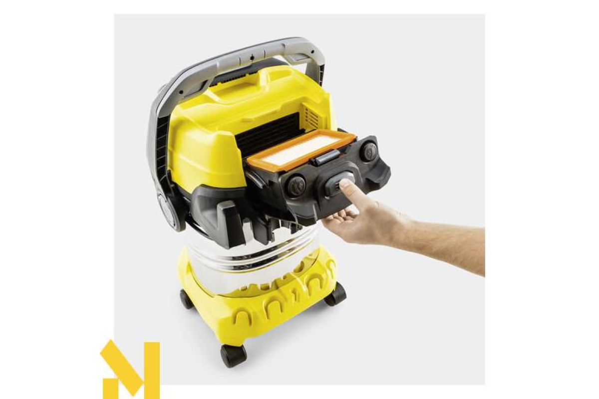 Господарський пилосос WD 5 S V-25/5/22 оптимально поєднується з всмоктуючим шлангом, що входить в комплект його поставки, і насадкою для підлоги, що перемикається, завдяки чому при невисокій споживаній потужності (1100 Вт) гарантуються чудові результати збору сміття всіх видів - сухого або волого великого чи дрібного. Апарат оснащений міцним 25-літровим сміттєзбірником з нержавіючої сталі, 5-метровим кабелем, всмоктувальним шлангом довжиною 2,2 м зі знімною антистатичною рукояткою, насадкою для підлоги, плоским складчастим фільтром і фільтр-мішком з нетканого матеріалу. Плоский складчастий фільтр дозволяє чергувати операції вологого та сухого прибирання без витрат часу на заміну фільтра, а запатентована система швидкого виймання виключає контакт з брудом. Система очищення фільтра, що активується натисканням кнопки, забезпечує швидке відновлення повної сили всмоктування. Завдяки знімній конструкції рукоятки насадки можуть приєднуватися безпосередньо до всмоктуючого шлангу, який може компактно і надійно зберігатися у верхній частині апарату. Для швидкого та зручного закріплення подовжувальних трубок та насадки для підлоги передбачені тримачі, сформовані у відбійнику пилососу.