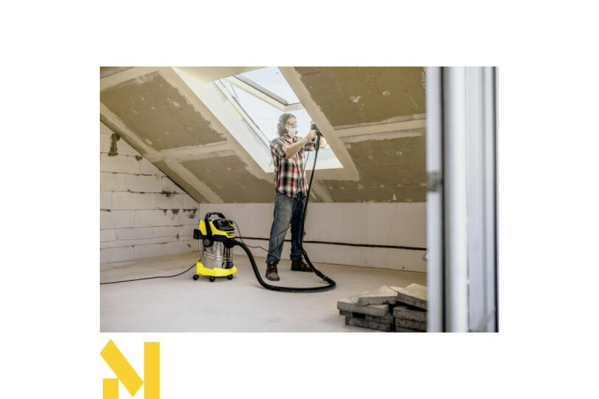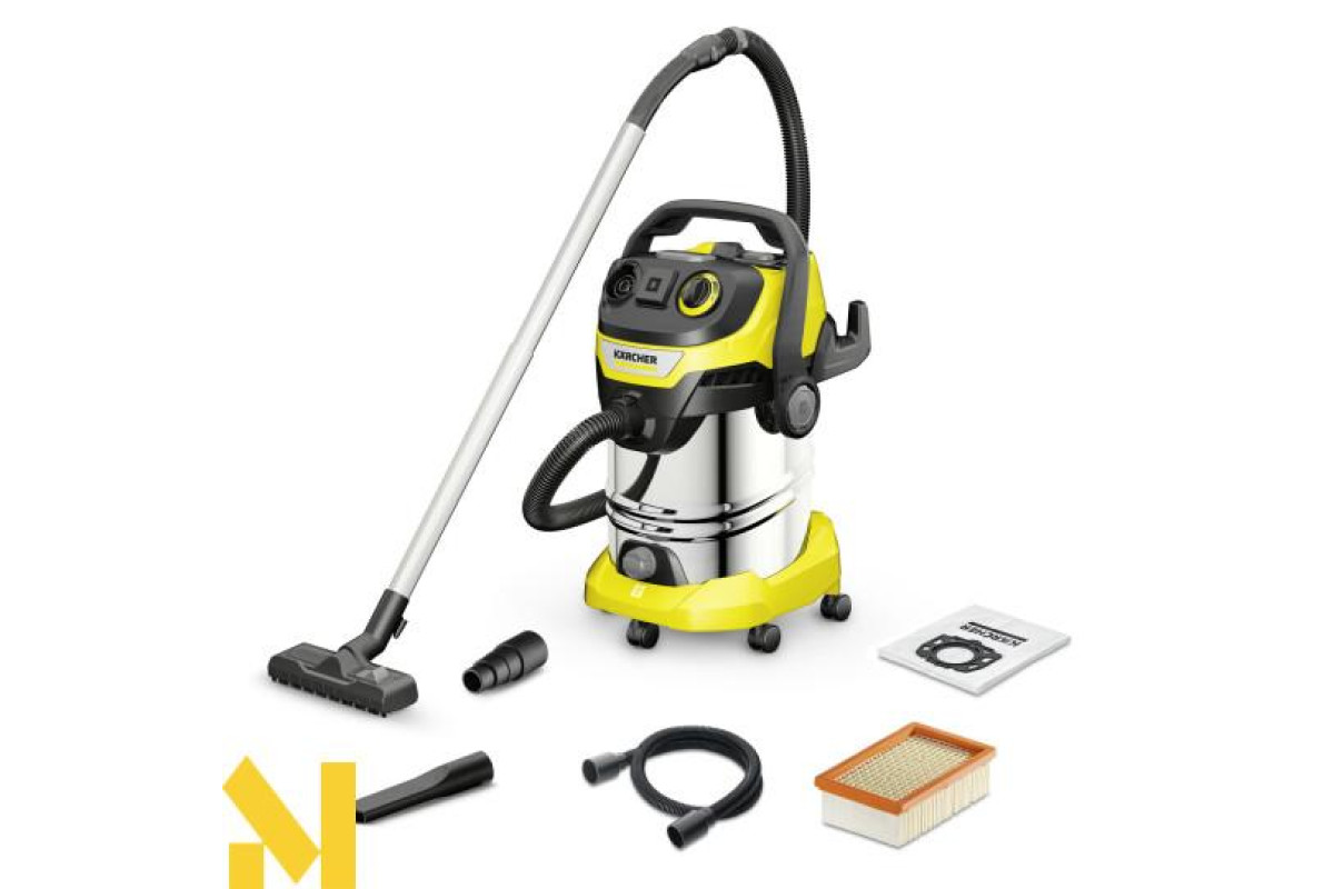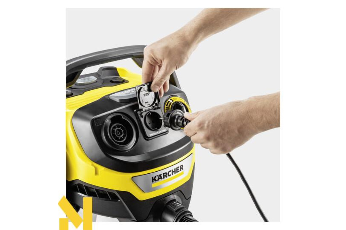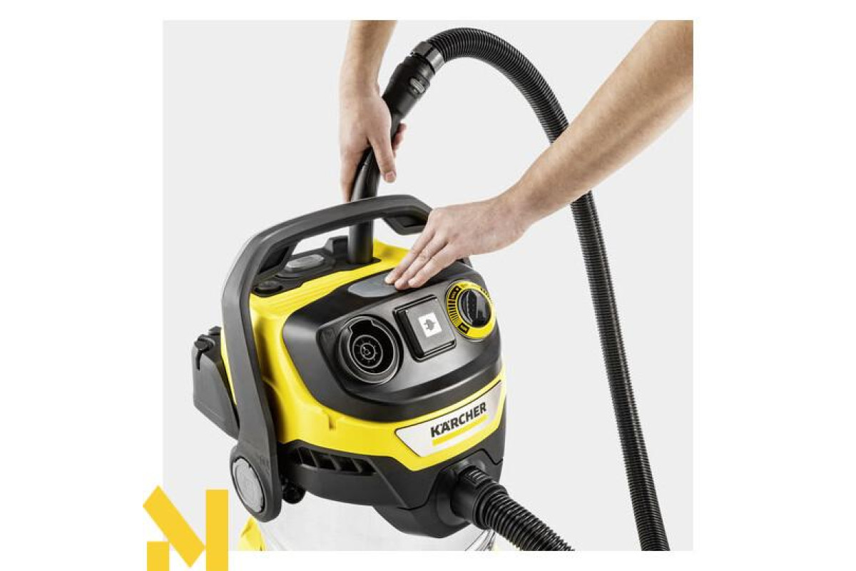 Енергоефективний господарський пилосос Kärcher WD 6 P S V-30/6/22/T, що має високу силу всмоктування, оснащений 30-літровим сміттєзбірником з нержавіючої сталі, 6-метровим кабелем, всмотувальним шлангом довжиною 2,2 м і вбудованою штепсельною розеткою для підключення електроінструменту.