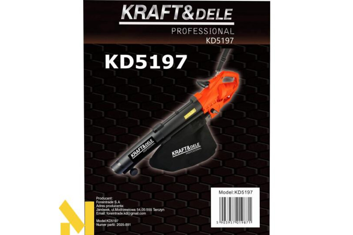 KD5197 — це потужний електричний повітродув для листя від KRAFT&DELE, створений для швидкого прибирання саду, під'їзду та території навколо будинку. Велика потужність та регульована швидкість роботи дозволяють пристрою ефективно справлятися як з легким сухим листям, так і з більшими забрудненнями, що надуваються на терасу чи тротуар.