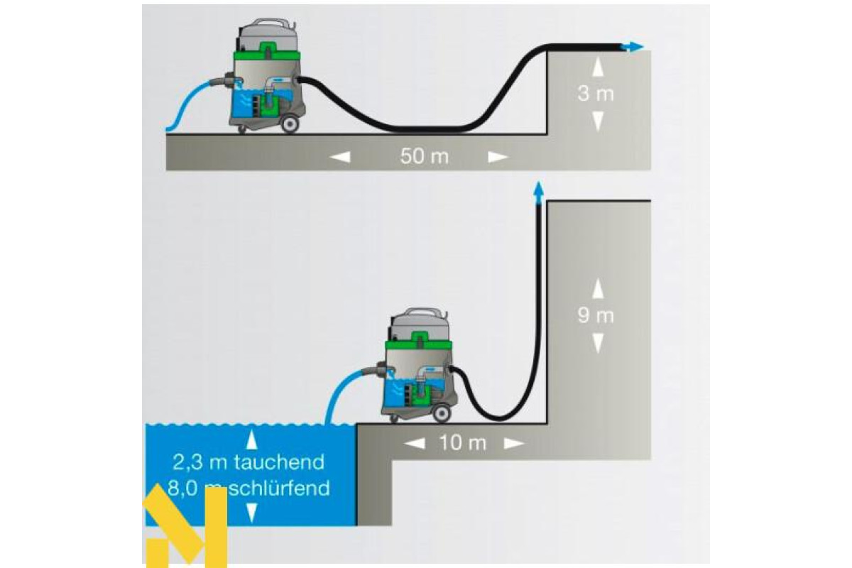 Промисловий пилосос Eibenstock EPS 50 призначений для збирання пилу та бруду. Постійно висока швидкість потоку 70 л/с, особливо міцний контейнер із ударостійкого пластику, високопродуктивний насос з продуктивністю до 14 000 л/год, окрема сітка фільтра для грубих частинок, 10-метровий шланг для стічних вод, також підходить для нормального використання у вакуумі, висока безпека завдяки автоматичному вимикачу PRCD підвищує час служби фільтра, скорочення тимчасових та фінансових витрат. Промисловий пилосос Eibenstock EPS 50 підходить для використання у будівельних компаніях, службах підтримки об'єктів, житлових об'єднаннях.