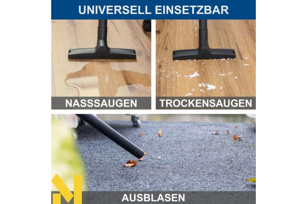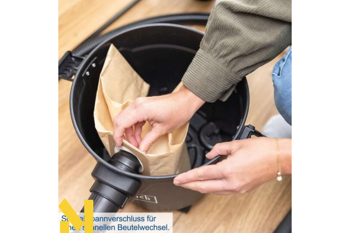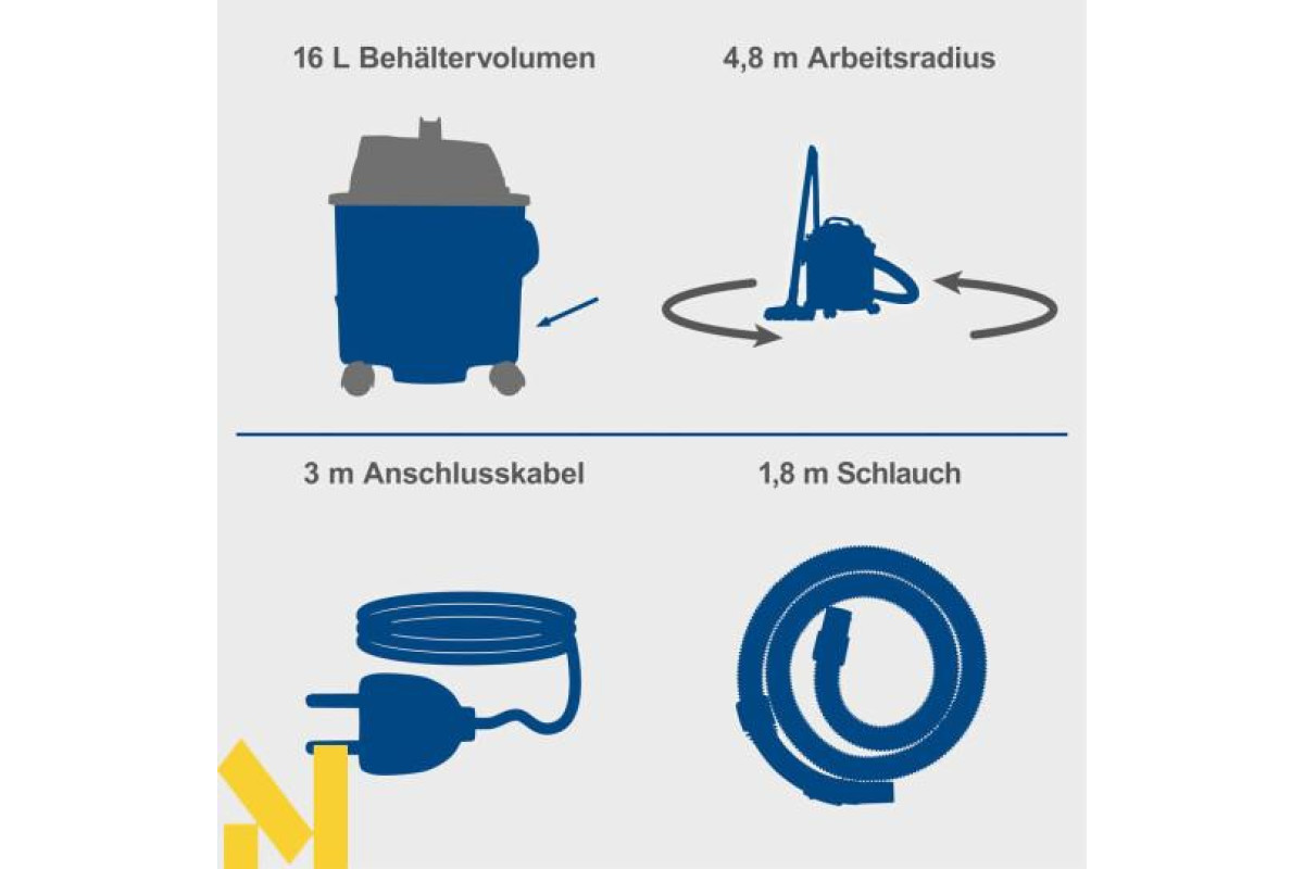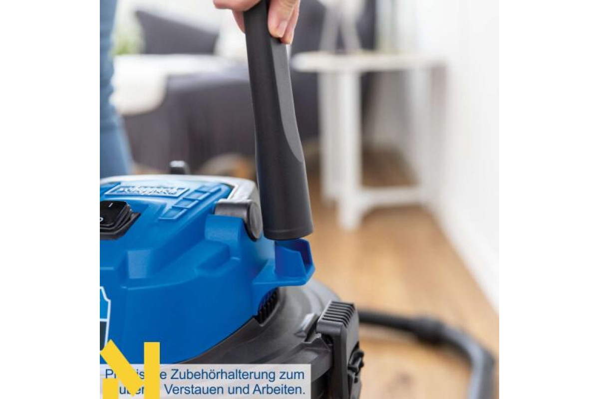 Чи то вдома, чи на будівельному майданчику, електричний пилосос для вологого/сухого прибирання Scheppach VC16 надійно видаляє пил, бруд та рідини з усіх типів підлог. Завдяки практичній функції видування, навіть важкодоступні місця можна легко очистити. Чотири плавно обертаються на 360° колеса та практична ручка для перенесення забезпечують легке транспортування. Міцний, ударостійкий контейнер для збору вміщує 16 літрів та оснащений швидкознімними кріпленнями для легкого спорожнення. VC16 постачається з всмоктувальним шлангом довжиною 1,8 м, трьома пластиковими подовжувачами довжиною 33 см, паперовим пакетом (сертифікованим FSC), поролоновим фільтром, щілинною насадкою та насадкою для підлоги.