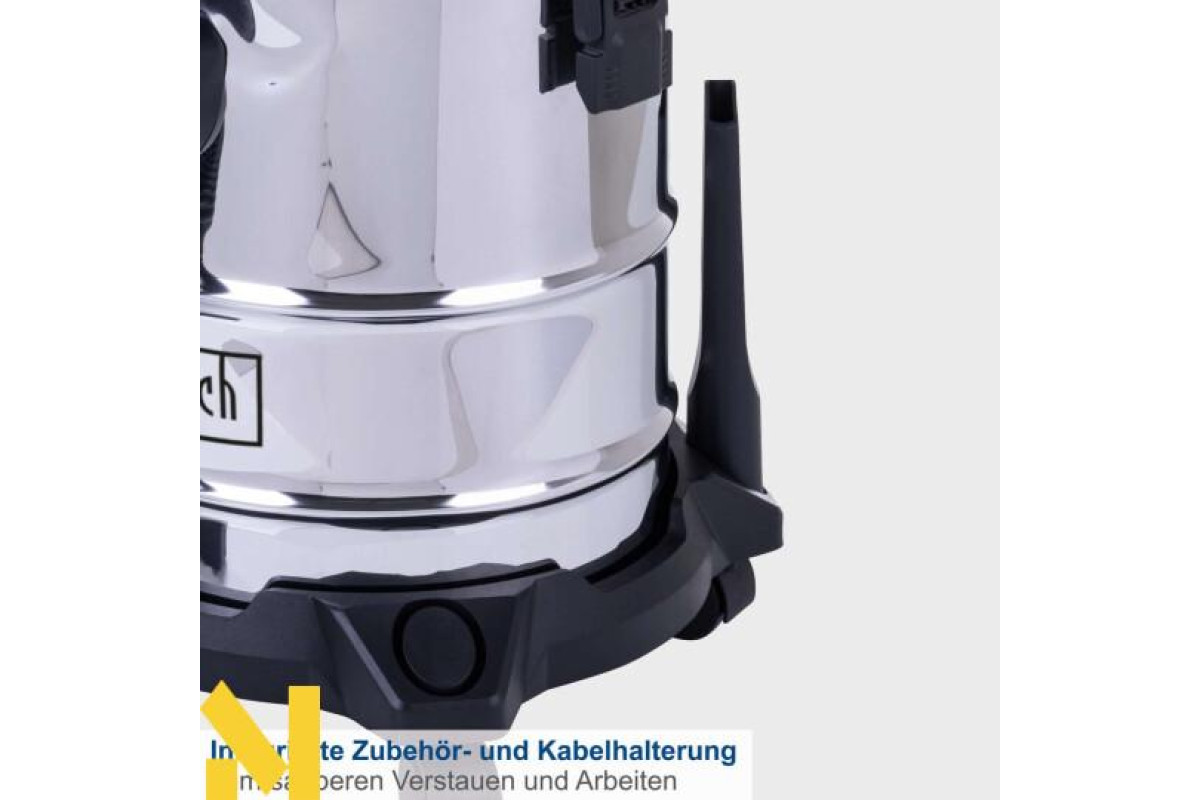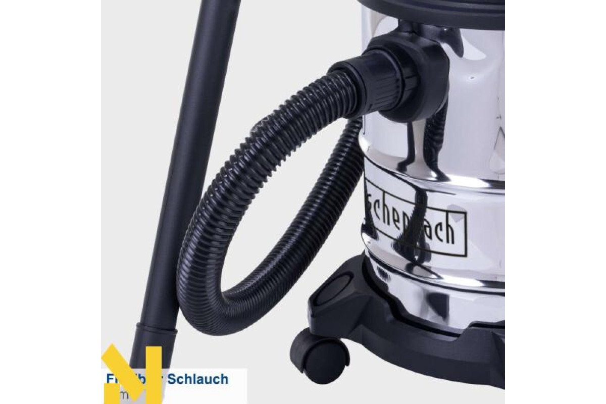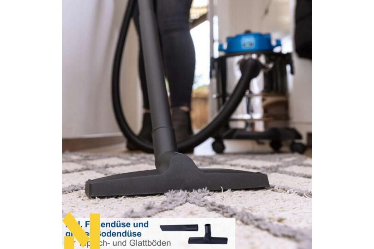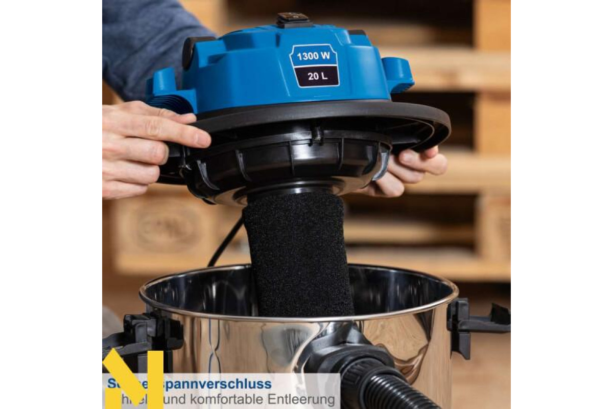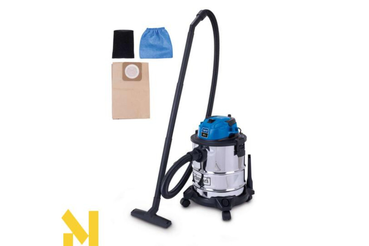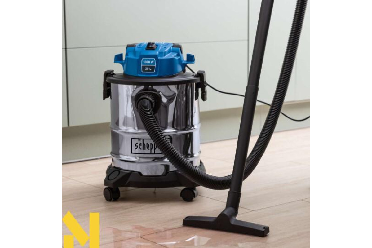 Електричний пилосос для вологого і сухого прибирання Scheppach VC20 надійно видаляє пил, бруд і рідини з будь-яких типів підлогових покриттів, що робить його ідеальним вибором для використання вдома або на будівельному майданчику. Функція видування дає змогу видаляти бруд навіть із важкодоступних місць. Завдяки чотирьом колесам, що плавно обертаються на 360°, і практичній ручці для перенесення пилосос легко транспортувати. Міцний, нержавіючий контейнер з нержавіючої сталі вміщує 20 літрів і оснащений швидкознімними застібками для легкого спорожнення. NTS20 комплектується паперовим мішком, поролоновим фільтром, текстильним фільтром, щілинною насадкою, насадкою для підлоги і трьома пластиковими подовжувальними трубками (330 мм кожна).