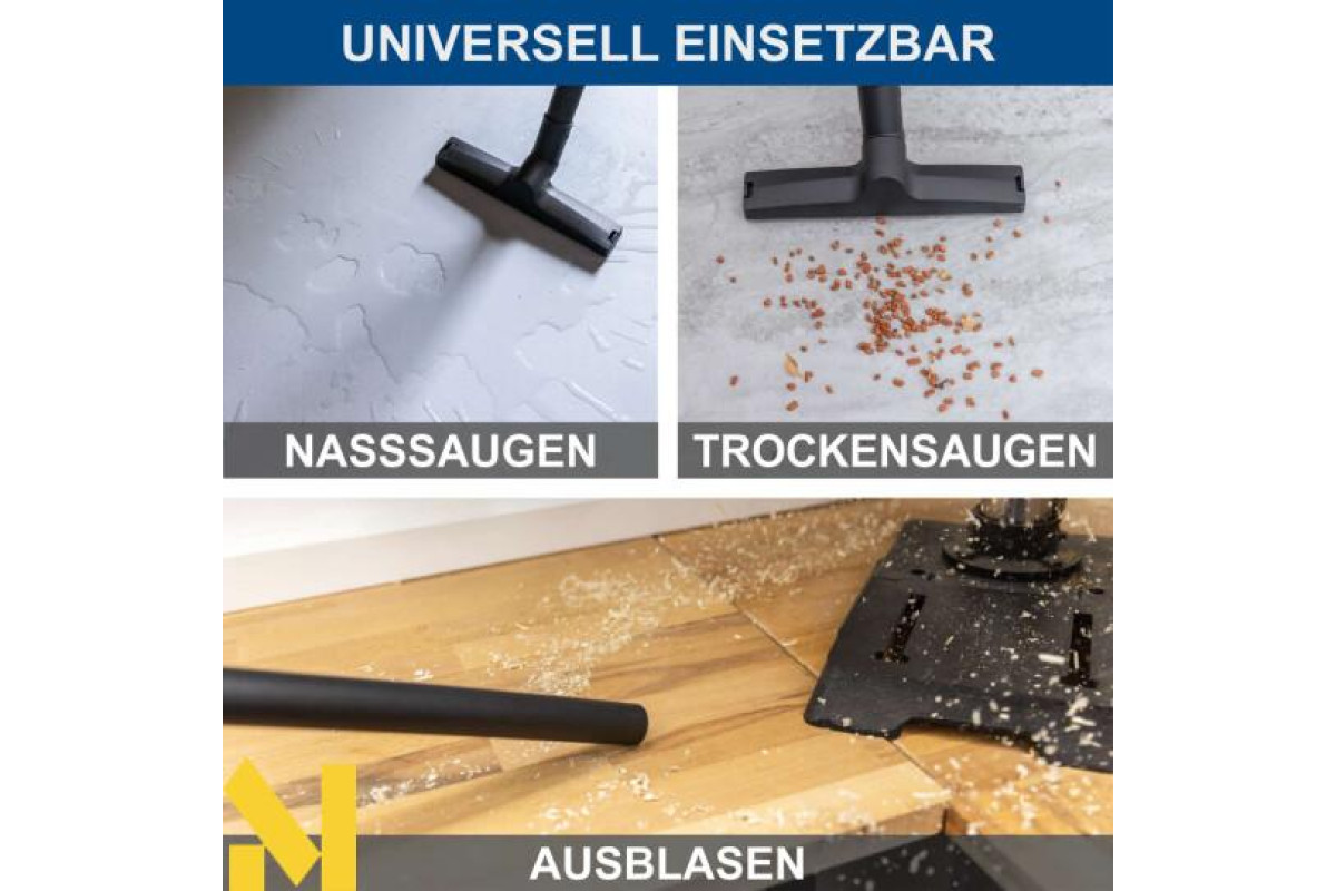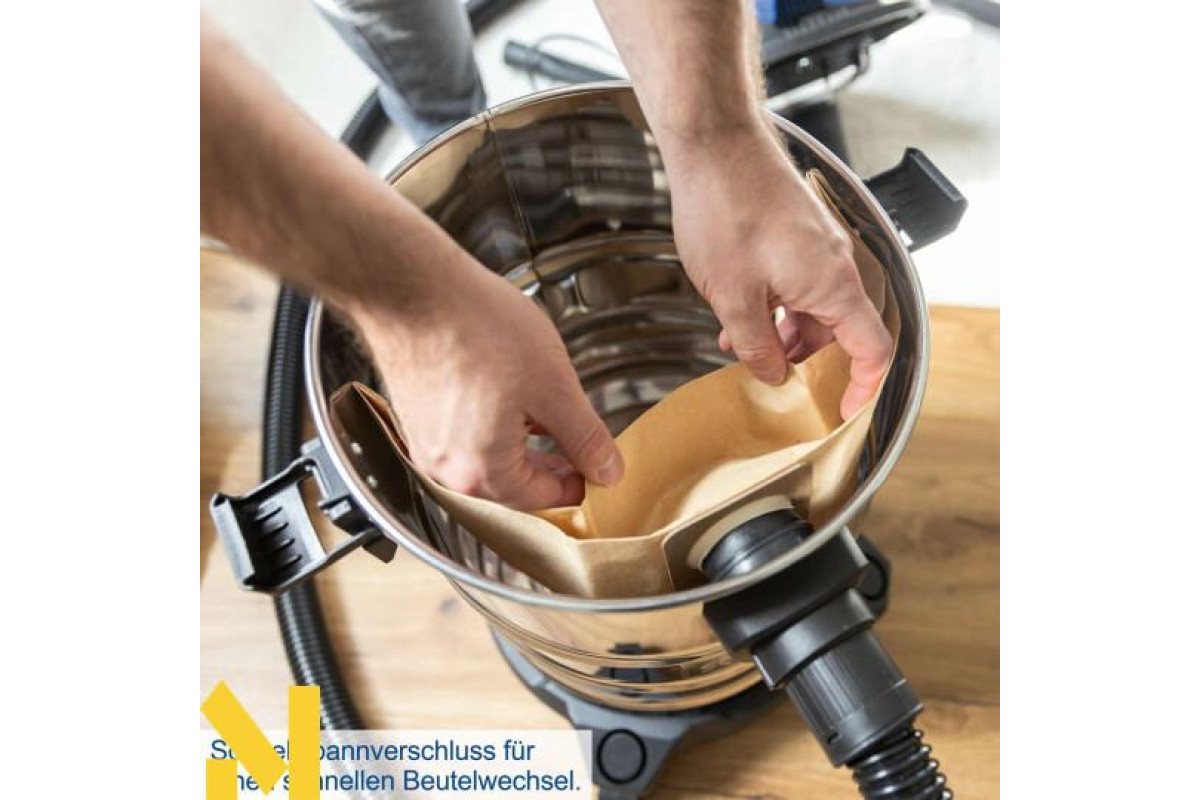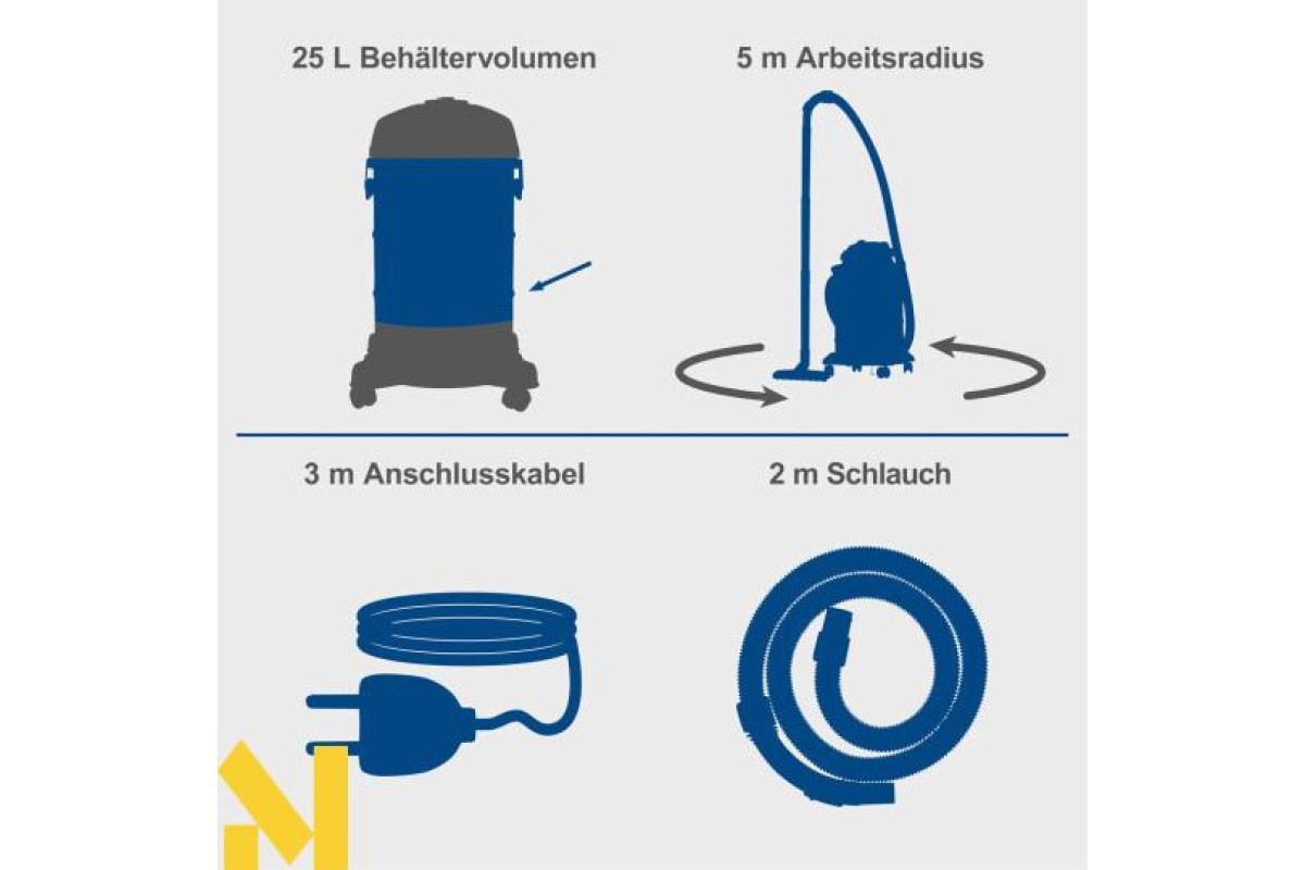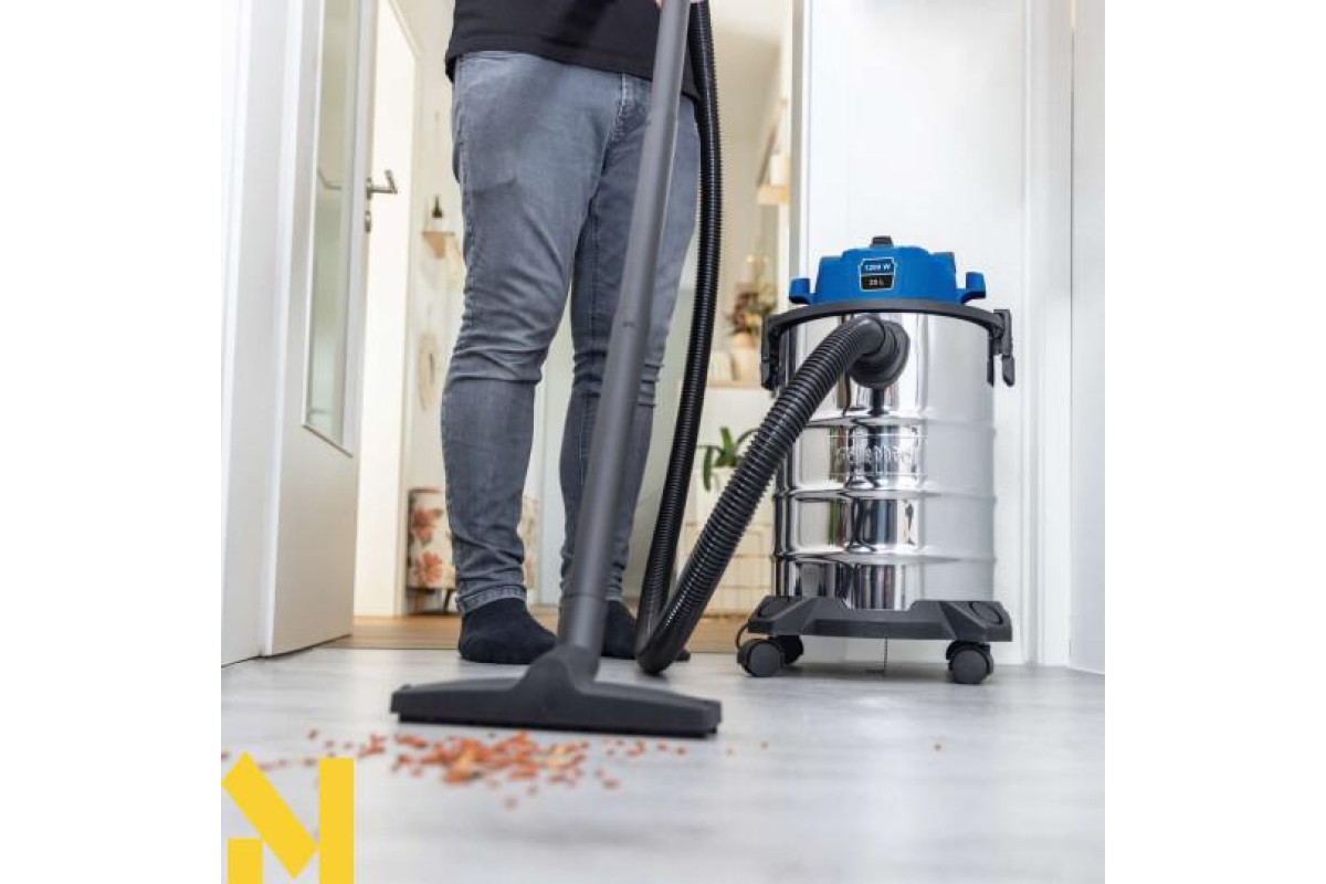 З потужністю всмоктування 20 кПа електричний пилосос для вологого/сухого прибирання Scheppach VC25 надійно видаляє пил, бруд та рідини з усіх типів підлог. Це робить його ідеальним для використання вдома або на будівельних майданчиках. Завдяки практичній функції видування, навіть важкодоступні місця можна легко очистити. Чотири плавно обертаються на 360° колеса та практична ручка для перенесення забезпечують легке транспортування. Міцний, стійкий до іржі контейнер для збору сміття з нержавіючої сталі вміщує 25 літрів та оснащений швидкознімними кріпленнями для легкого спорожнення. VC25 постачається з 2-метровим всмоктувальним шлангом, трьома пластиковими подовжувачами довжиною 33 см, паперовим пакетом (сертифікованим FSC), поролоновим фільтром, щілинною насадкою та насадкою для підлоги.