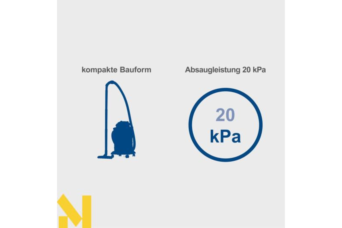 Компактний пилосос для вологого/сухого прибирання з тиском 20 кПа для вологого та сухого прибирання, а також видування повітря.
