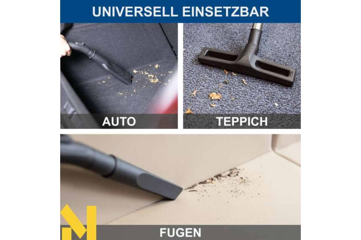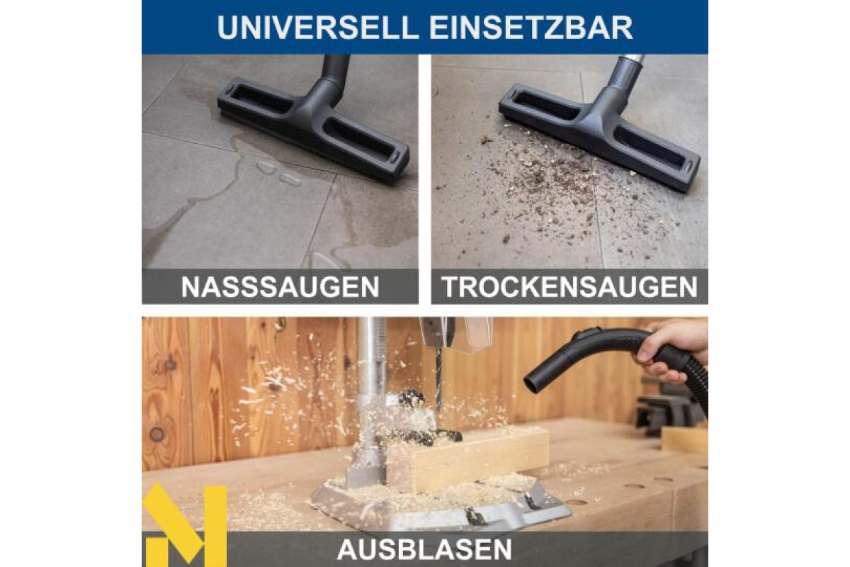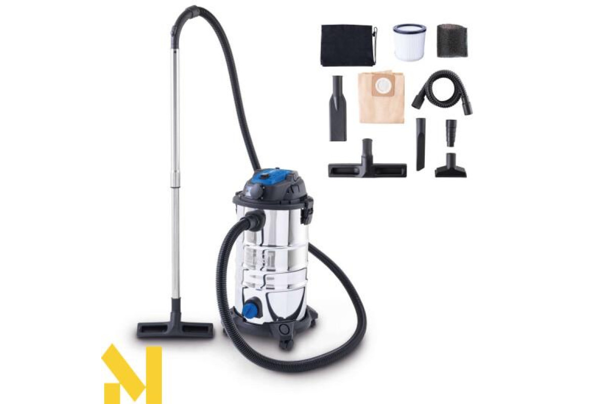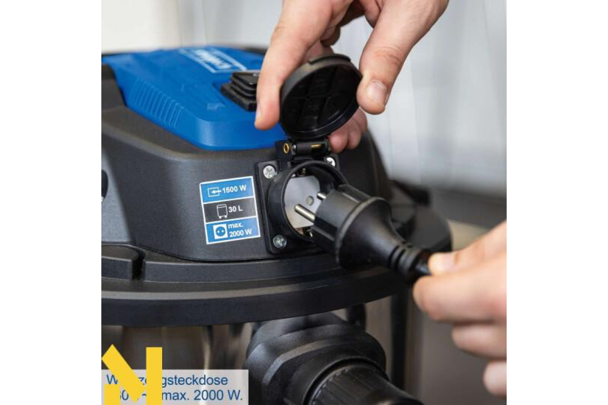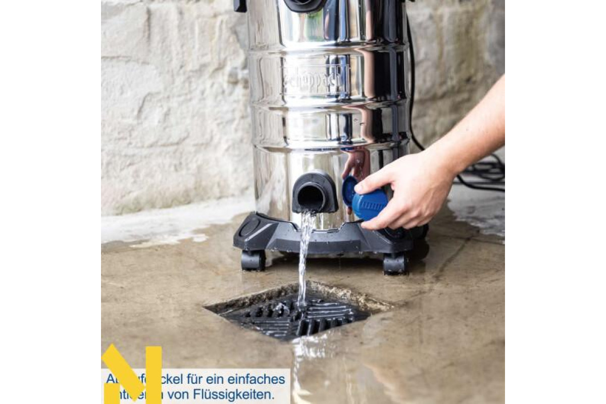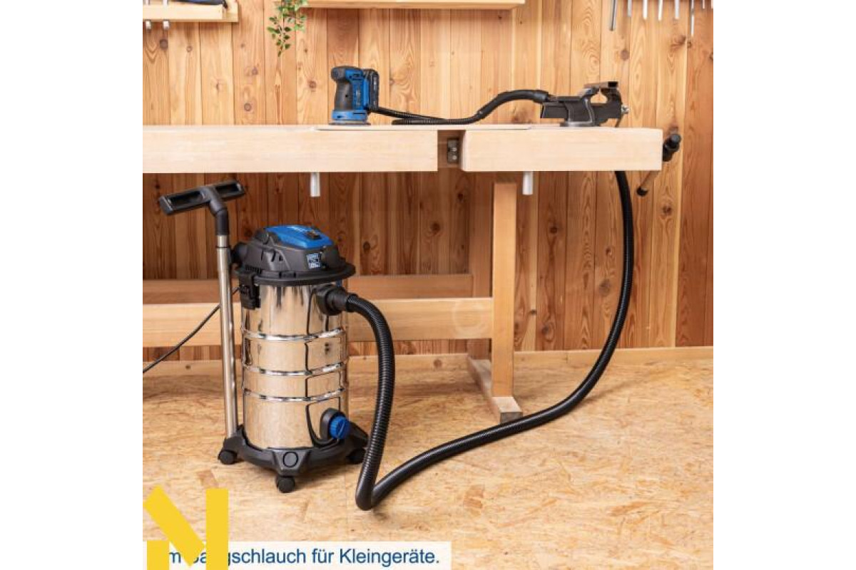 Електричний пилосос для вологого/сухого прибирання Scheppach VC30 Premium з потужністю 20 кПа та електродвигуном потужністю 1200 Вт — це практичний універсальний пилосос для дому, майстерні чи гаража. Завдяки практичній функції 3-в-1 — вологе пилососіння, сухе пилососіння та видування повітря — пилосос надійно видаляє пил, бруд та рідини. Функція ручного очищення фільтра також забезпечує постійно високу потужність всмоктування. Міцний, стійкий до іржі контейнер для збору сміття з нержавіючої сталі вміщує 30 літрів і оснащений зливною пробкою для легкого спорожнення. VC30 Premium постачається з 3-метровим всмоктувальним шлангом, 1-метровим всмоктувальним шлангом для дрібної побутової техніки, алюмінієвою телескопічною трубкою, паперовим пакетом (сертифікованим FSC), поролоновим фільтром, щілинною насадкою, насадкою для сухої підлоги, насадкою для вологої підлоги, автомобільною насадкою, насадкою для м’яких меблів, складчастим фільтром, адаптером для підключення та сумкою для аксесуарів.