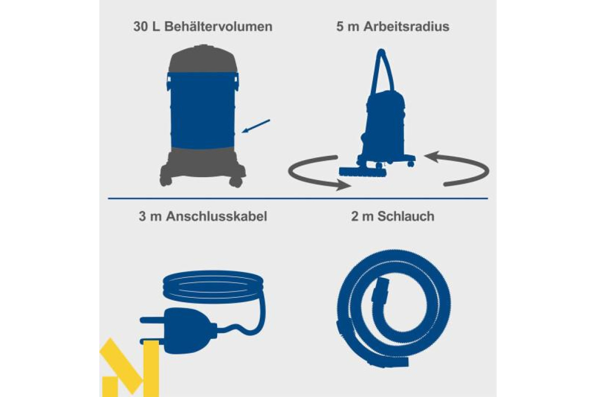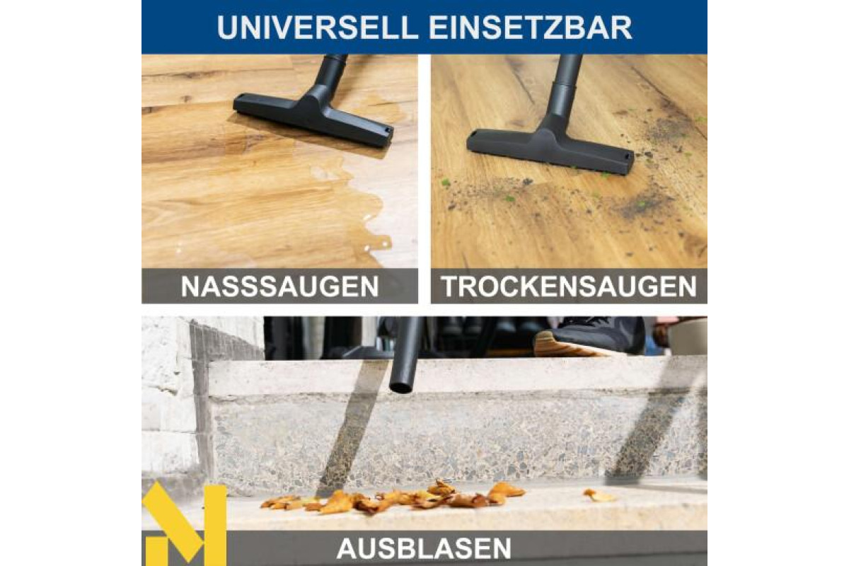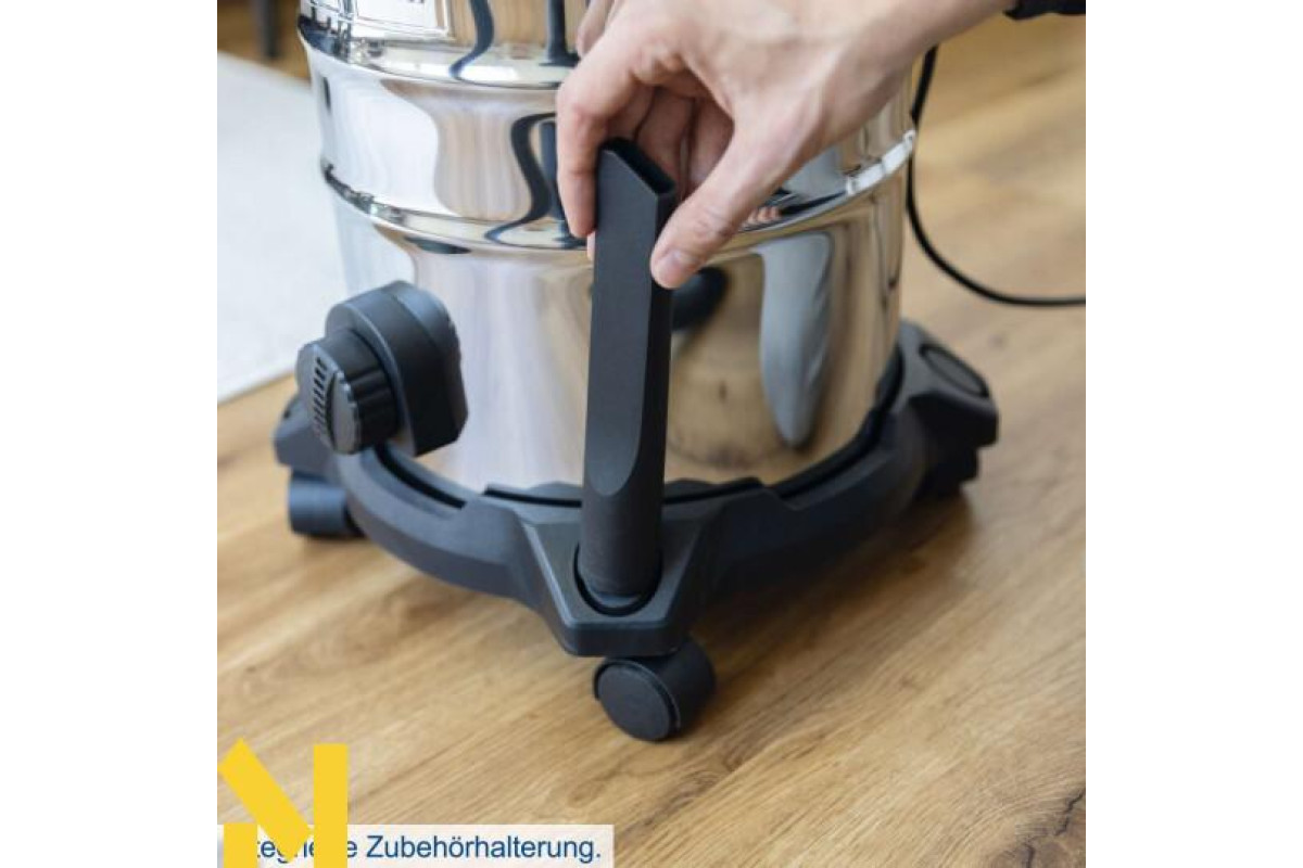 З потужністю всмоктування 20 кПа електричний пилосос для вологого/сухого прибирання Scheppach VC30V2 надійно видаляє пил, бруд та рідини з усіх типів підлог. Завдяки практичній функції 3-в-1 – вологе пилососіння, сухе пилососіння та видування повітря – VC30V2 ідеально підходить для використання вдома або на будівельному майданчику. Чотири плавно обертаються колеса на 360° та практична ручка для перенесення забезпечують легке транспортування. Пилосос для вологого/сухого прибирання постачається з 2-метровим всмоктувальним шлангом, трьома пластиковими подовжувачами довжиною 33 см, паперовим пакетом (сертифікованим FSC), поролоновим фільтром, щілинною насадкою та насадкою для підлоги.