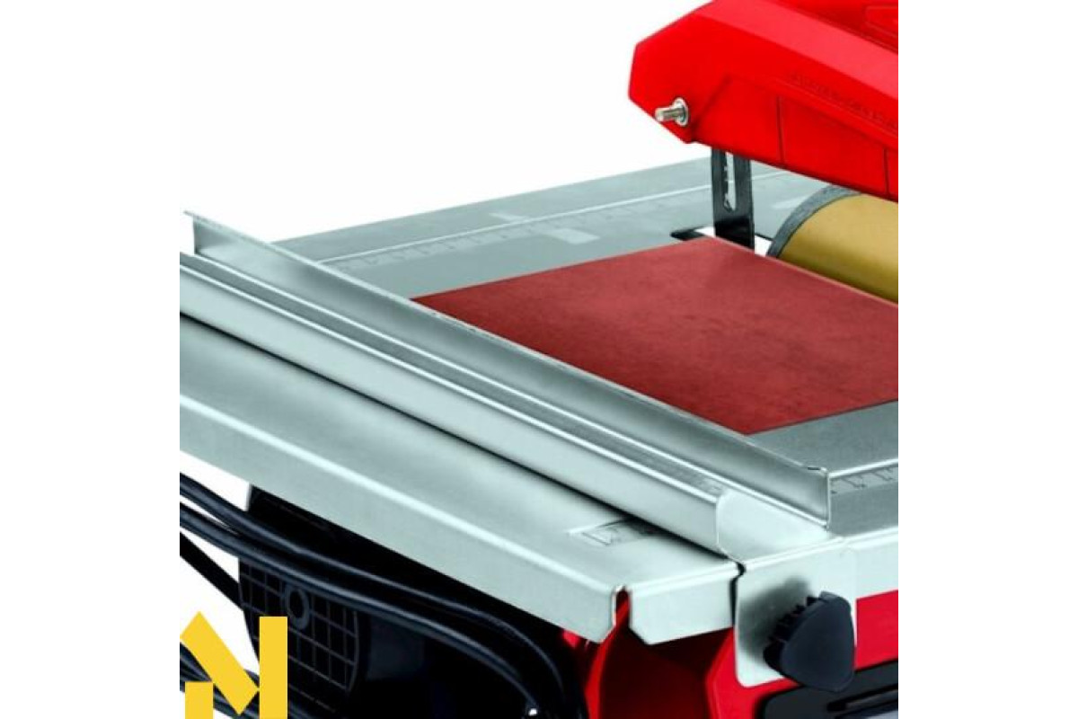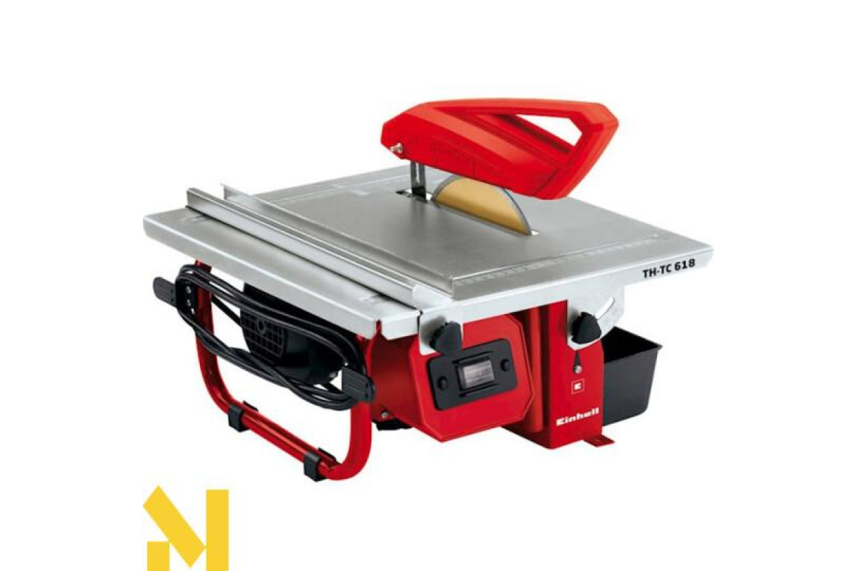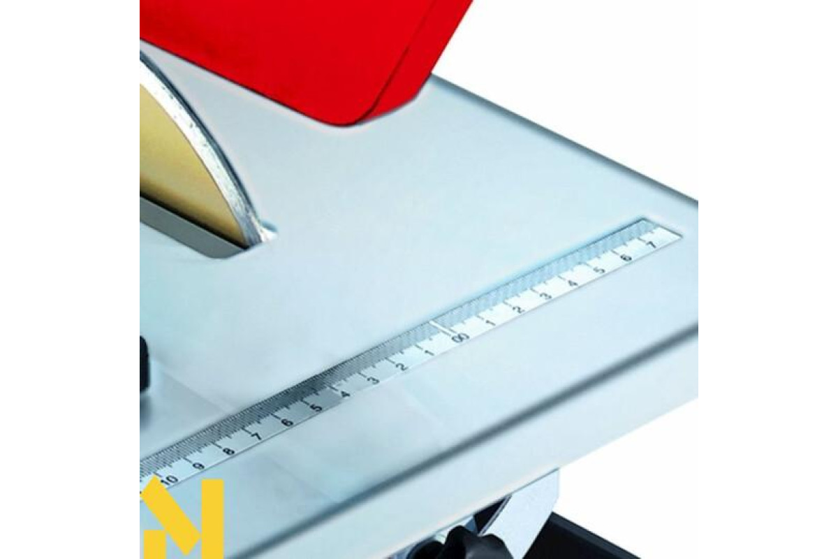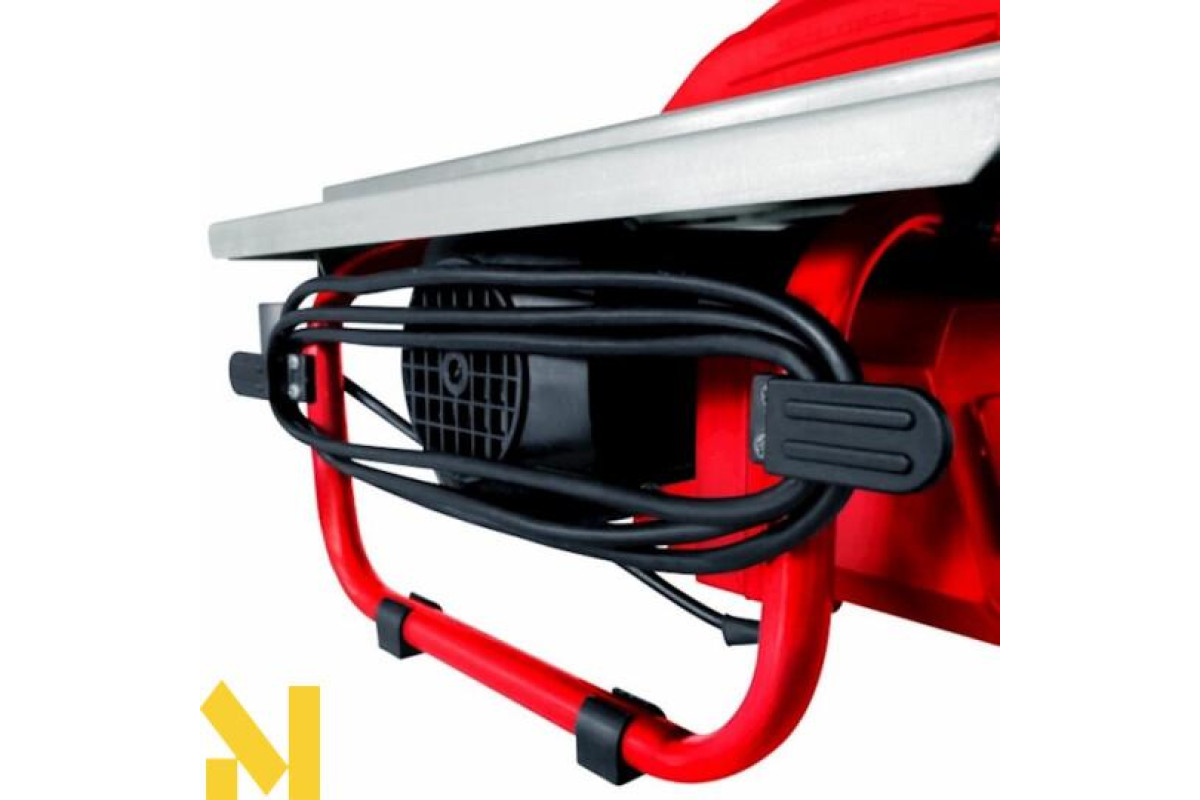 Плиткорез оснащений електромотором потужністю 600 Вт і обладнаний 180 мм алмазним ріжучим диском, який охолоджується в спеціальній ємності з водою.