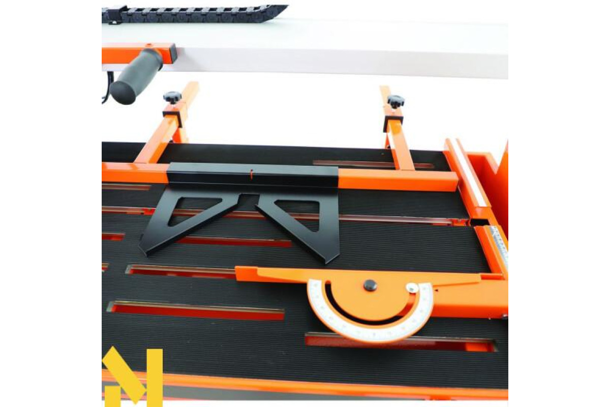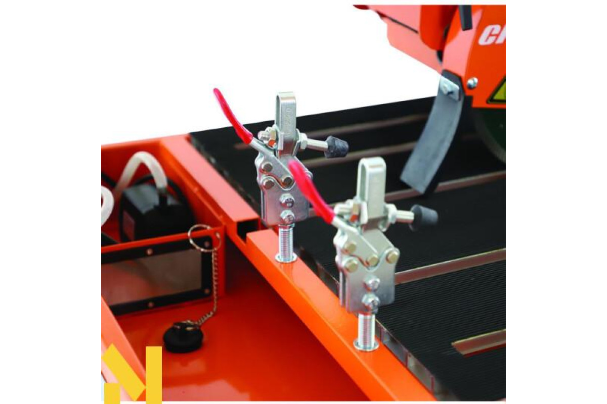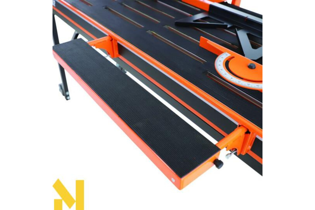 Верстат обладнаний двигуном потужністю 1.5 кВт, який встановлений в рухомому пиляльному блоці на посилену направляючу консоль. Станина з регулювальними упорами для прямого та діагонального різання має бічне розширення стола. Гумове покриття станини та затиски для плитки сприяють ідеальному різанні плитки без вібрації. Складні ніжки сталевої рами обладнані з одного боку двома колесами для зручного пересування верстата в робочому приміщенні.