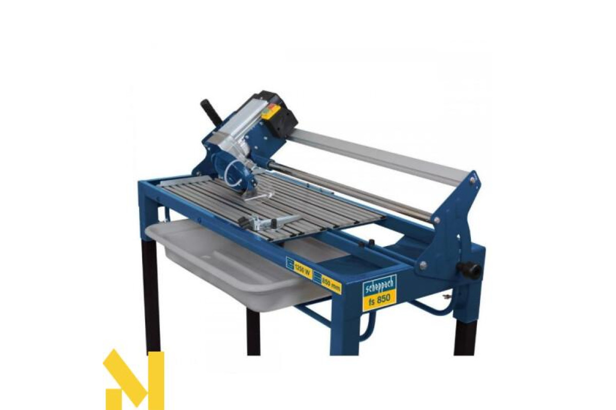 Електричний каменеріз SCHEPPACHFS 850 – це стіл з гумовим килимком та потужним двигуном, що знаходиться на направляючій рейці. Він може працювати з великою плиткою. Ріжуча головка на електричному плиткорізі SCHEPPACHFS 850 гарантує довжину різу до 850 мм, та - під кутом 45°. Для пришвидшення та збільшення роботи станок SCHEPPACHFS 850 може виконувати подвійну та похилу різку. Для точного різання, і не тільки, може використовуватися, майже безперервно. Він оснащений насосом, який подає охолоджуючу рідину на алмазний ріжучий диск, діаметром 180 мм. Бездоганне охолодження досягається також завдяки бачку для рідини, на 18 л., який легко знімається та при необхідності заповнюється водою.