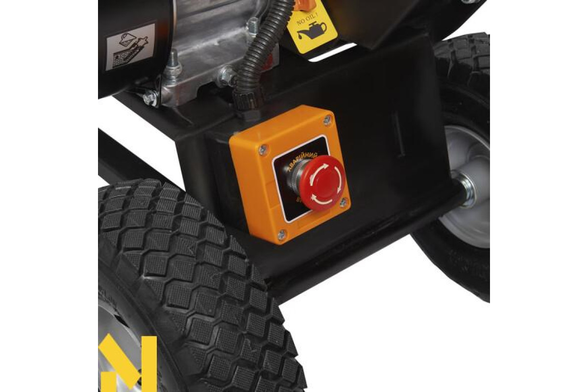 Для зручності користувачів передбачені транспортувальні колеса, які дозволяють легко переміщати подрібнювач по ділянці або на об’єктах благоустрою. Об’єм паливного бака становить 3,6 л, що забезпечує тривалий час безперервної роботи, а об’єм масла в картері – 0,6 л.