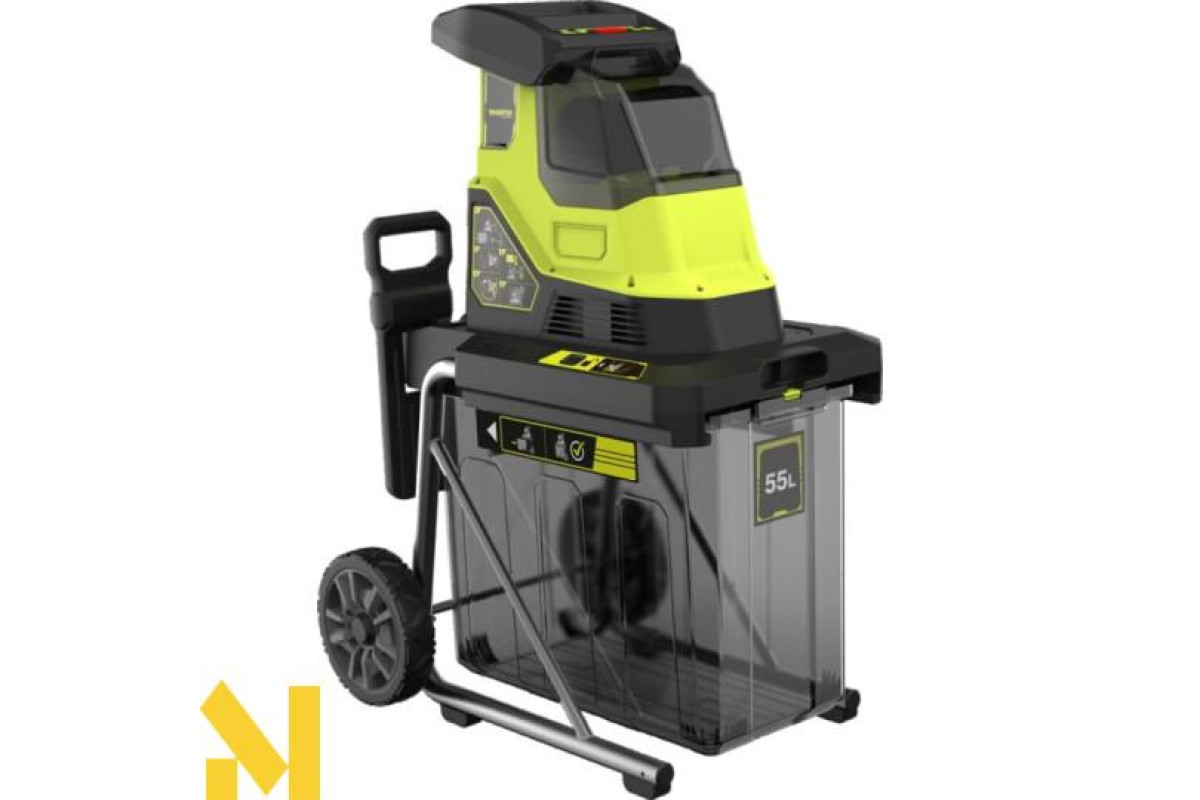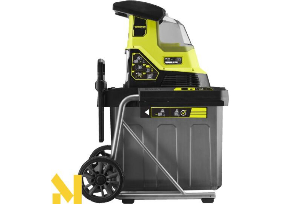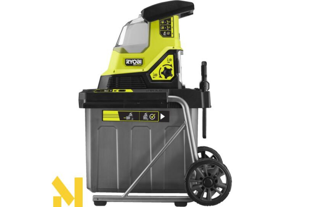 Подрібнювач має міцну металеву раму та великі колеса для легкого переміщення, а також безпроблемну систему автоматичного розблокування реверсу. Контейнер для відходів вміщає до 55 л подрібненого матеріалу, що полегшує утилізацію садових відходів.