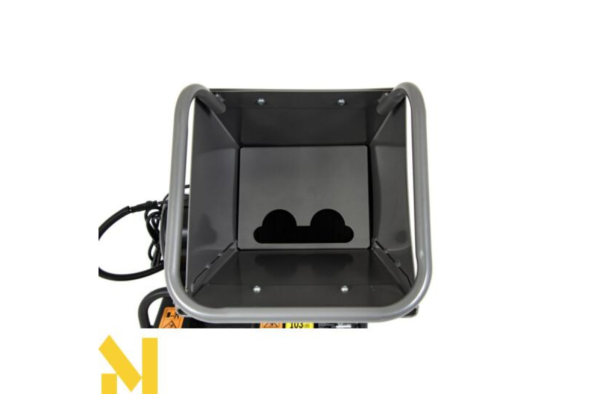 Удосконалений ріжучий механізм і контейнер для обрізання: барабанний механізм ефективно подрібнює гілки та садове сміття, забезпечуючи плавну роботу та зводячи до мінімуму необхідність частого спорожнення контейнера. Контейнер для шматочків об'ємом 64 л, оснащений вимикачем присутності, забезпечує безпечне і комфортне використання - пристрій не запуститься без правильно прикріпленої ємності, що підвищує рівень захисту користувача.