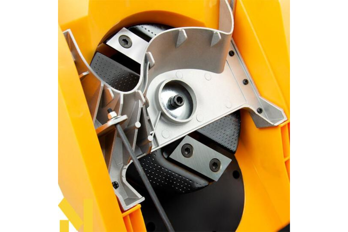 Двосторонні з’ємні ріжучі ножи забезпечують високу продуктивність різання як сирої так і сухої деревени та гілок. За потреби їх досить легко заточувати на звичайному заточному верстаті.