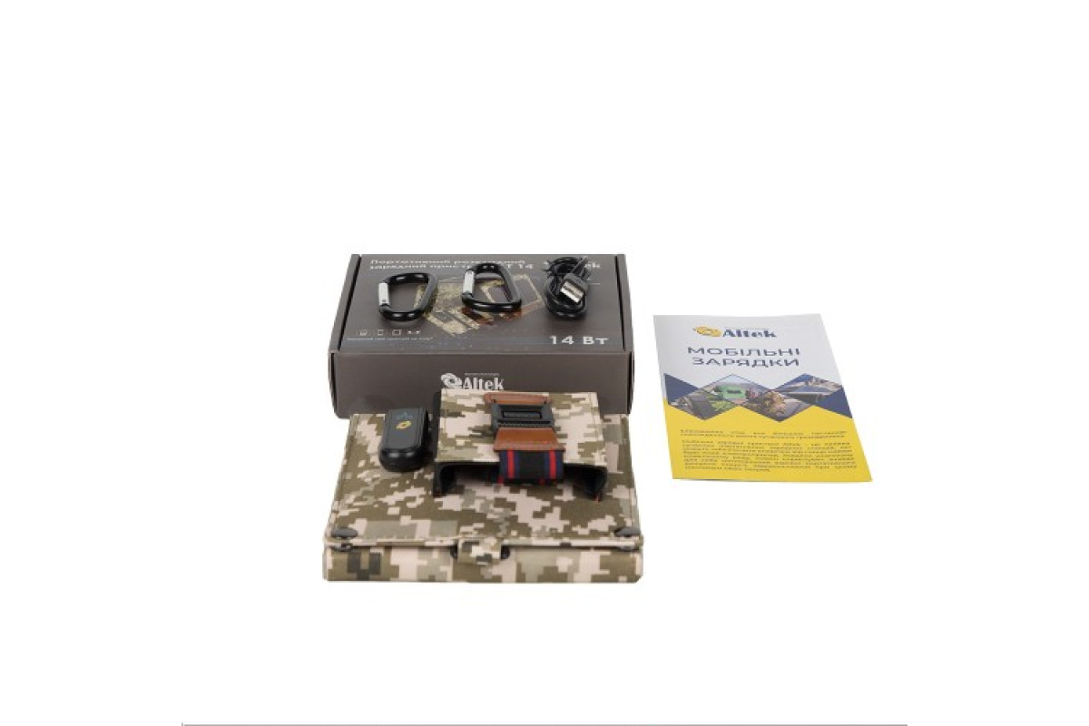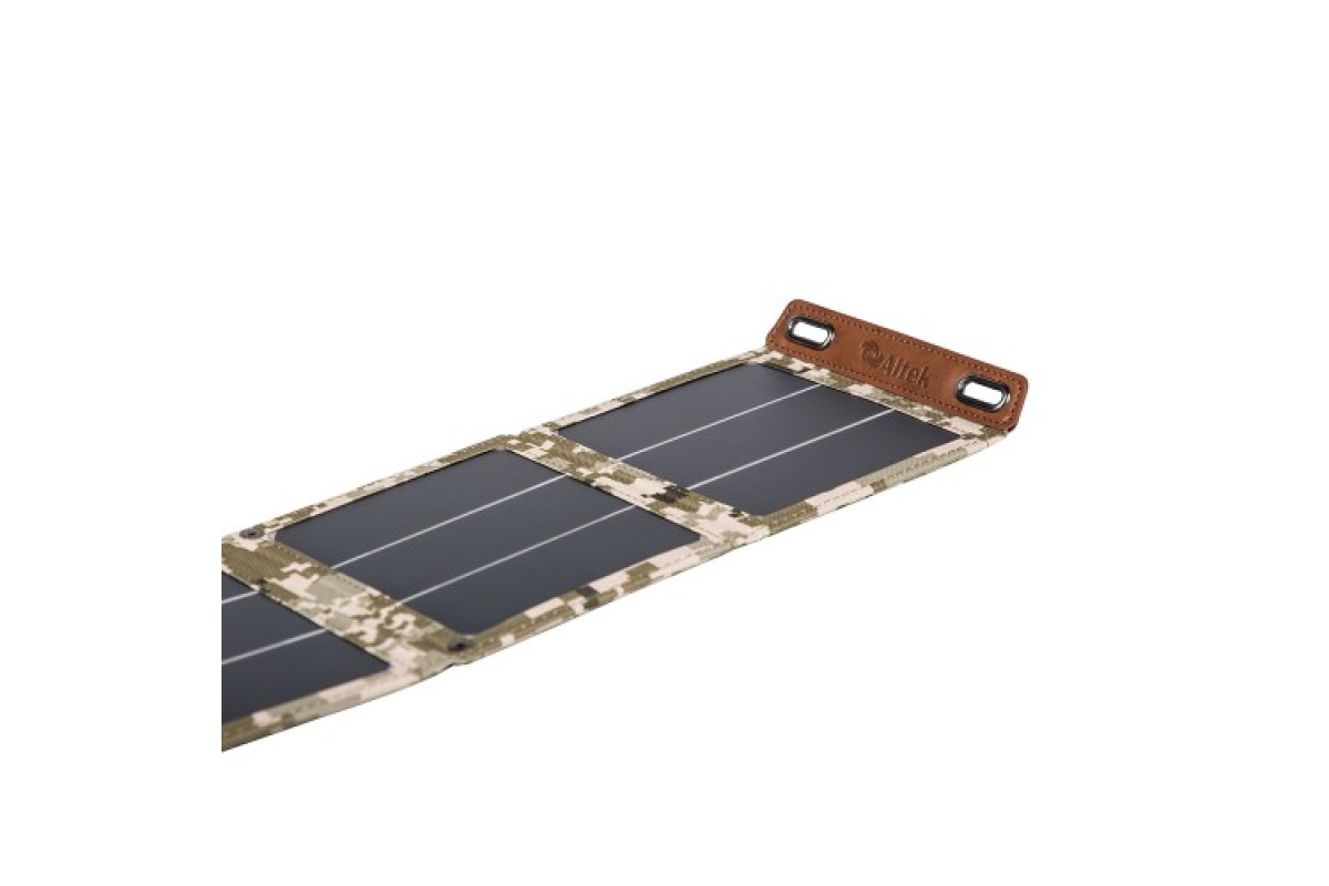 Монокристалічна сонячна панель ALTEK ALT-14, потужністю 14Вт з USB виходом для заряду смартфонів, павербанків та інших невеликих пристроїв. Ідеальна для подорожі, дуже компактна, зі зручним кріпленням для рюкзаків.