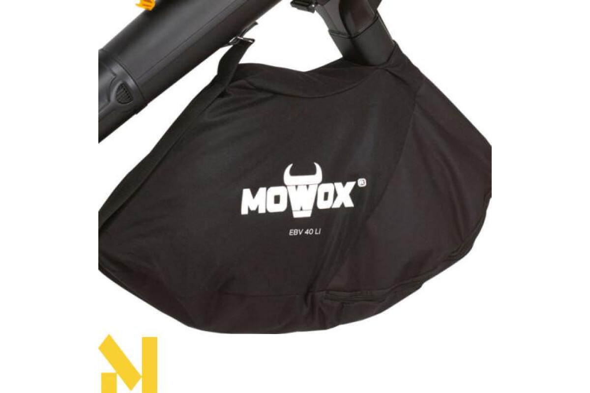 Бездротова повітродувка-пилосос Mowox EBV 40 Li зі функцією подрібнення стане в пригоді для домашнього, професійного застосування. Садовий апарат 2-в-1 легко переобладнати без допомоги інструментів. Безщітковий мотор живиться від 40 В батареї постійного струму. Частота обертів (до 13000 об/хв) сприяє високій продуктивності видування (6 м³/хв), забору повітря (9.63 м³/хв). Інструмент доставляється без зарядного пристрою та елементів живлення, проте з 32 л мішком зі цупкої тканини.