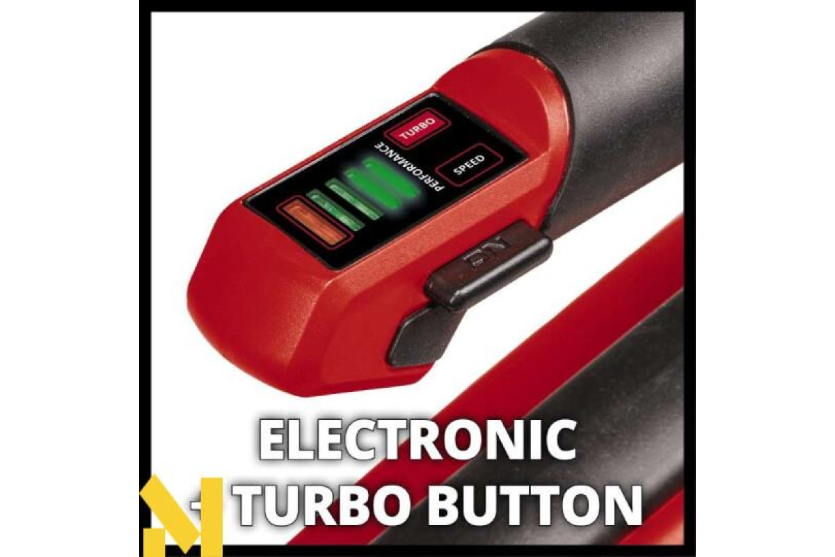 Акумуляторна повітродувка GP-LB 18/200 Li E-Solo забезпечує відмінні результати видування завдяки безщітковому двигуну Einhell. Для тих місць, де інструмент особливо інтенсивно використовується, є перемикач турбо для максимальної потужності дуття.