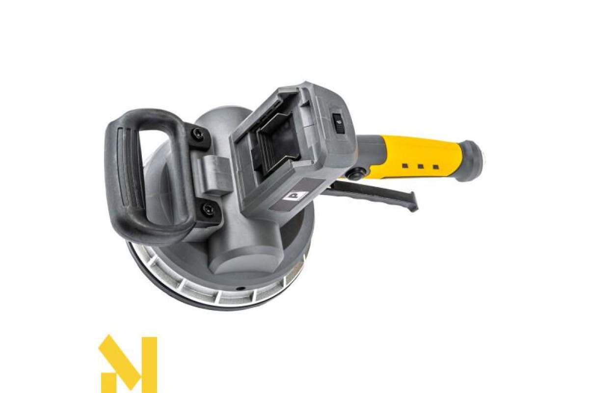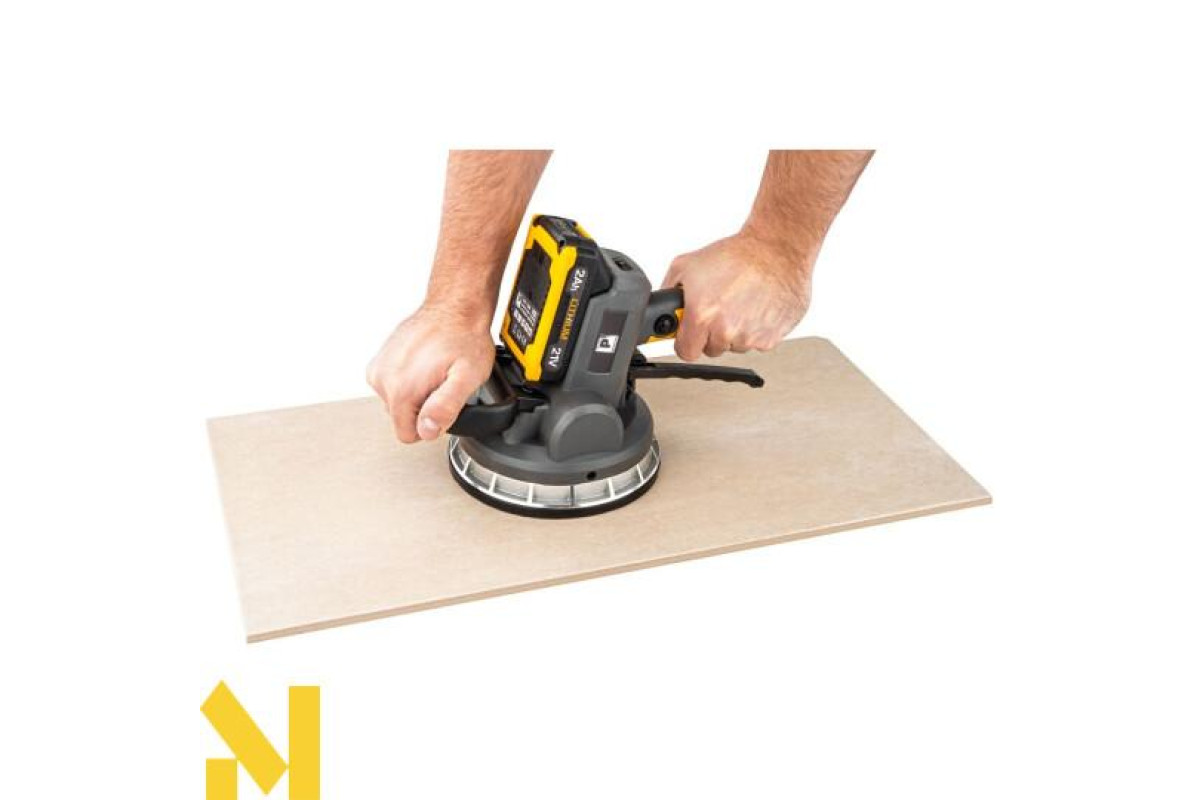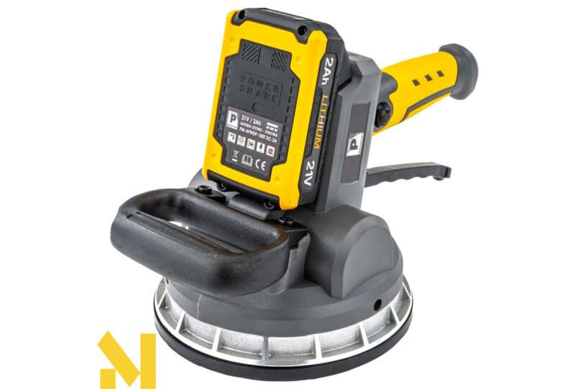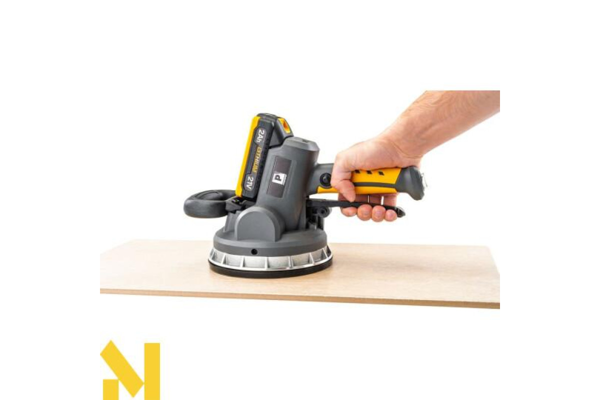 Присоска, що живиться від літієвої батареї 21 В,полегшує укладання великих плит і плиток,замінюючи традиційне ручне керування. Завдяки ергономічній ручці та регульованій інтенсивності вібраціїзабезпечує стабільність і точність.