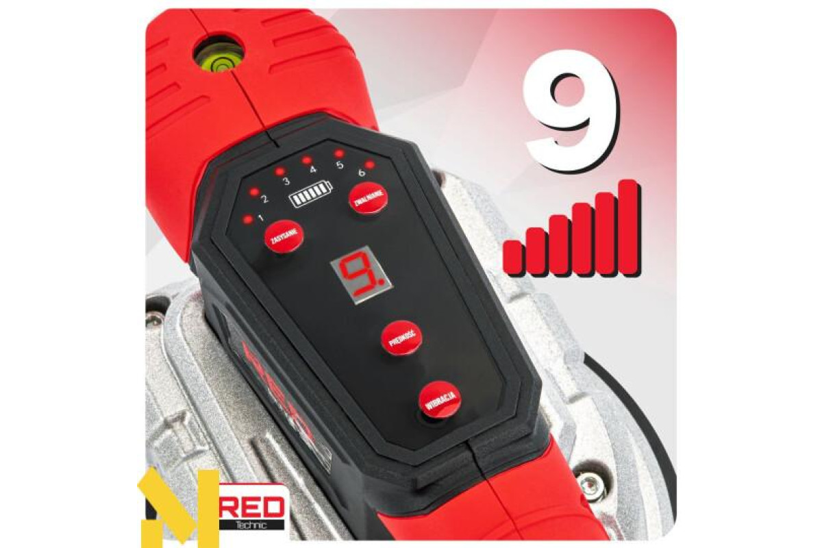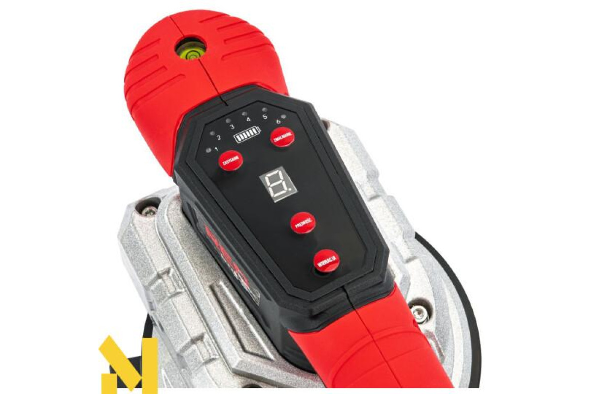 Вбудована кнопка регулювання дозволяє 9-рівневе налаштування інтенсивності вібрації залежно від розміру та типу матеріалу, забезпечуючи точне та рівномірне укладання плитки.