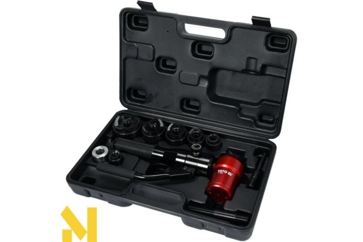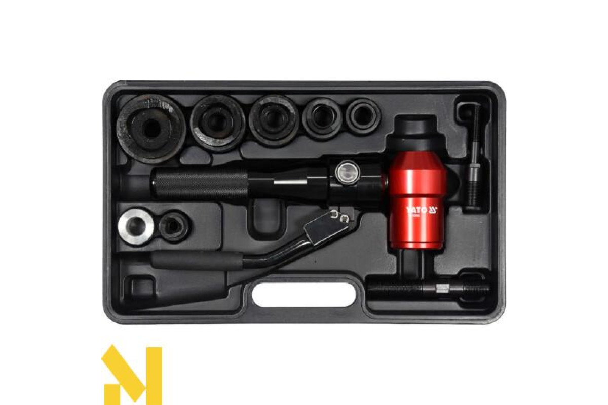 Набір для вирізання круглих отворів у металевих листах діаметром від 22 до 60 мм. Головка ручного гідроциліндра може повертатись на 360 градусів. Він призначений для вирізання отворів під час виробництва розподільних шаф для встановлення ящиків або вимикачів. При вирізанні отворів поверхня листа не деформується і не ушкоджується.