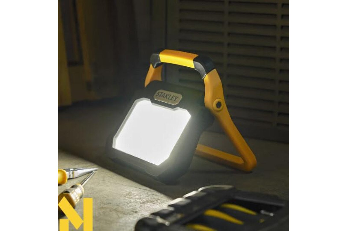 Прожектор працює безперервно до 6 годин на одному заряді, а заряджається приблизно за 3,5 годин. Можливість встановлення на універсальний штатив Stanley (SXLS37627E) додає гнучкості у використанні.