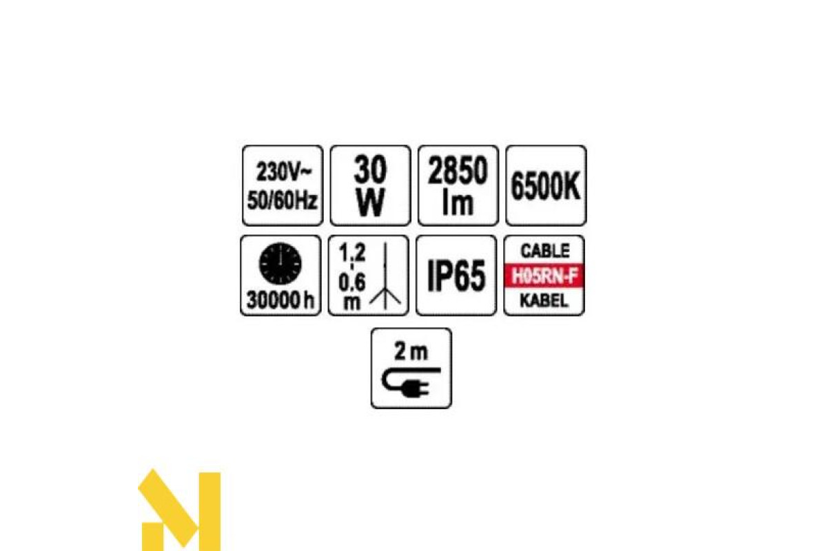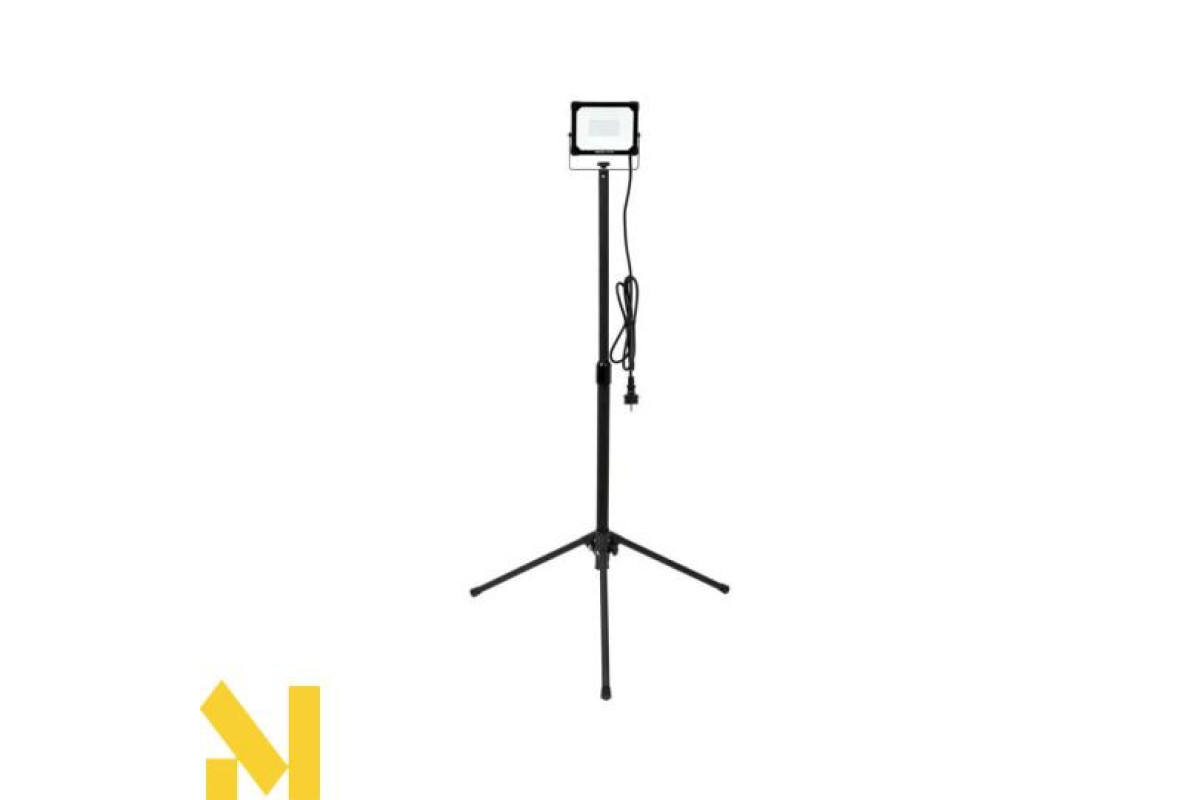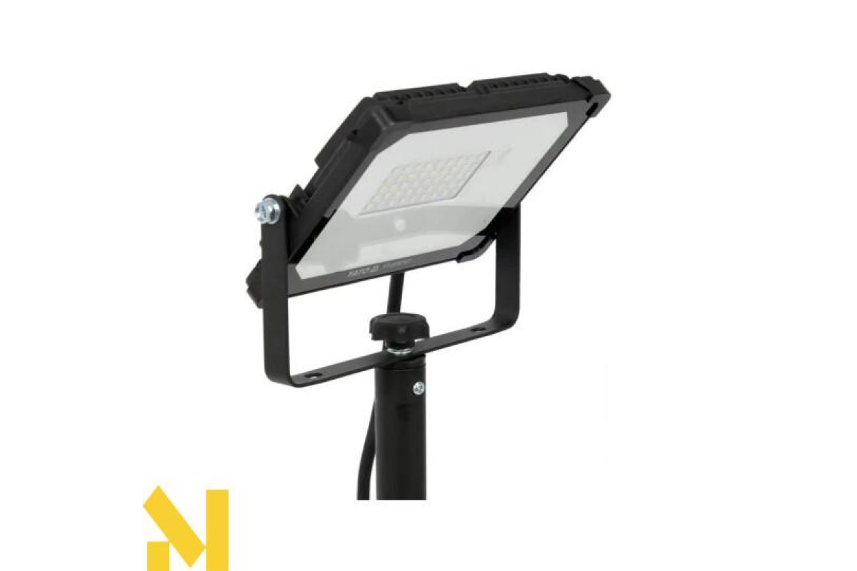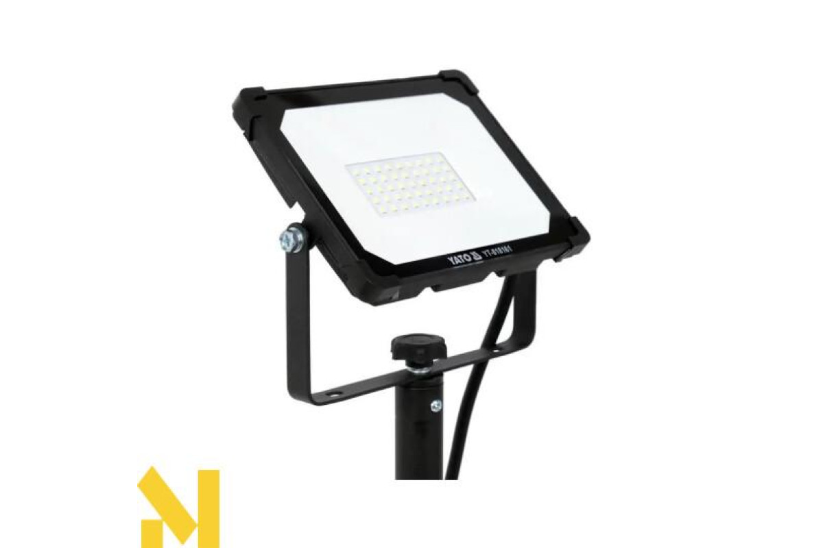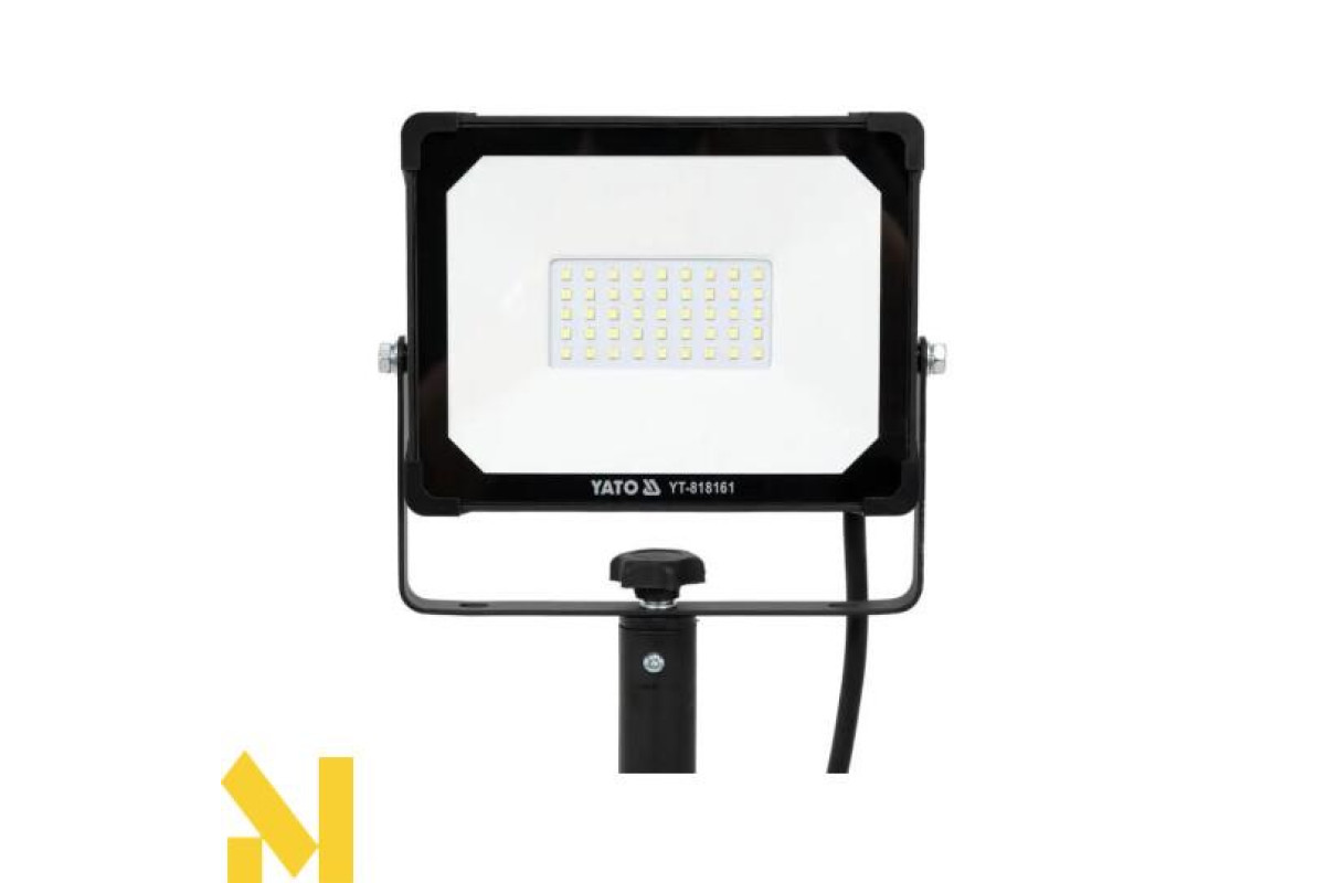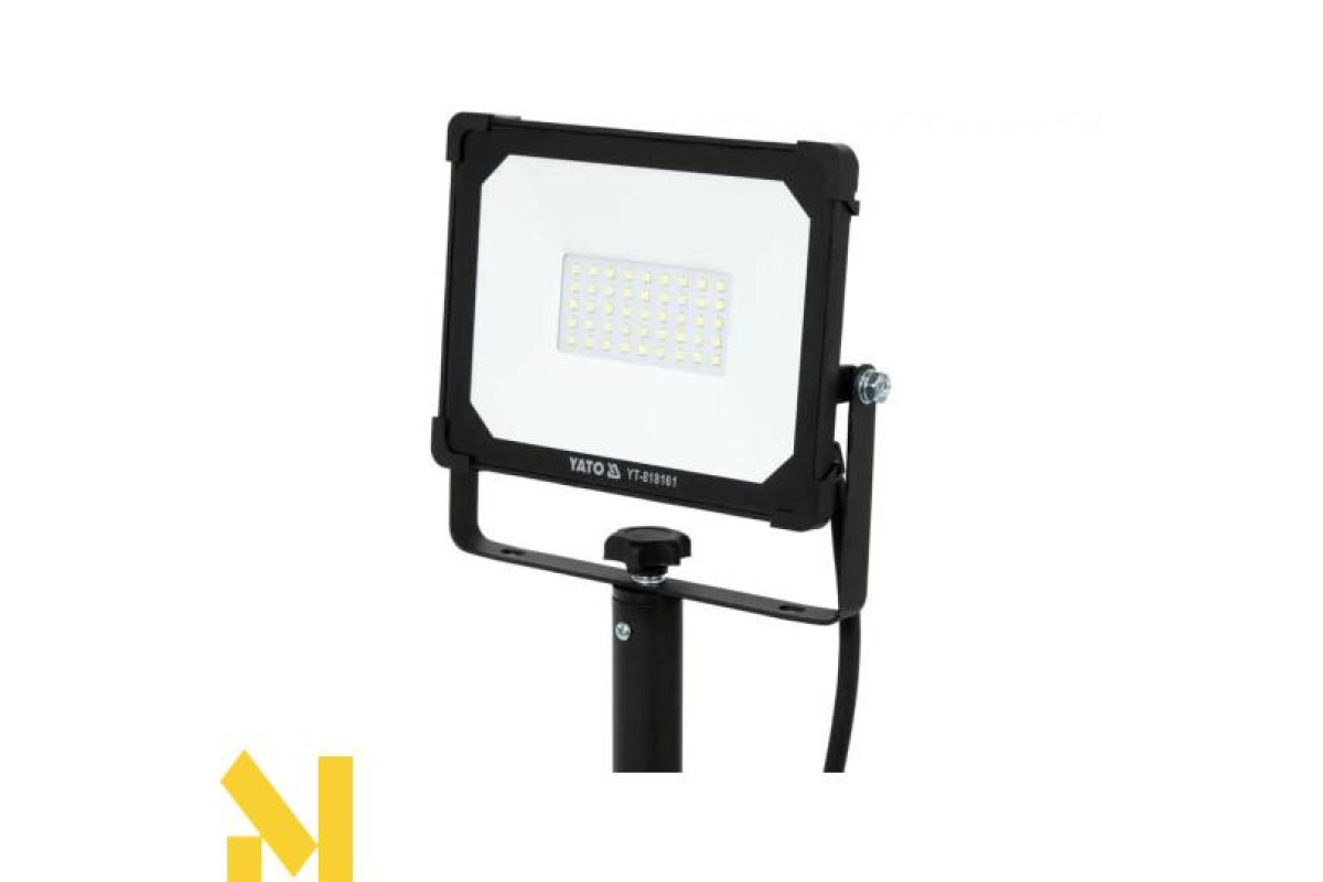 Плоский прожектор YATO YT-818161 з ефективними світлодіодами SMD LED, встановлений на стійкій регульованій стійці. Клас герметичності IP65 дозволяє використовувати його у вуличних умовах.
