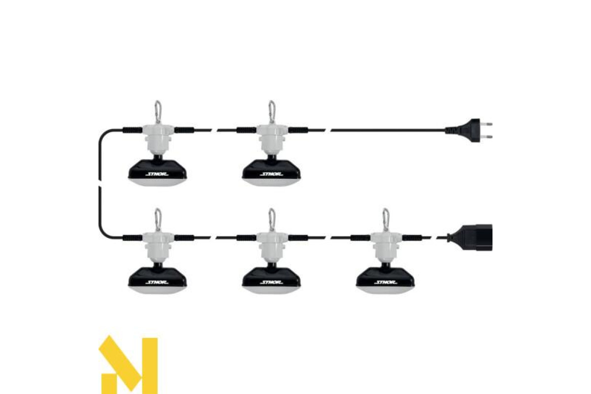 Комплект із 5 рефлекторів COB загальною потужністю 4500 лм. Фари з'єднуються за допомогою кабелю довжиною 15,4 м. Можливість комбінування (максимум 10 комплектів). Кожен відбивач має гачок для підвішування.