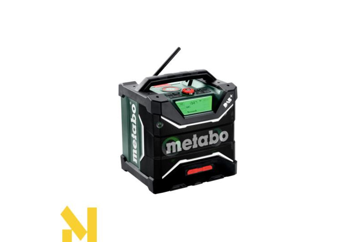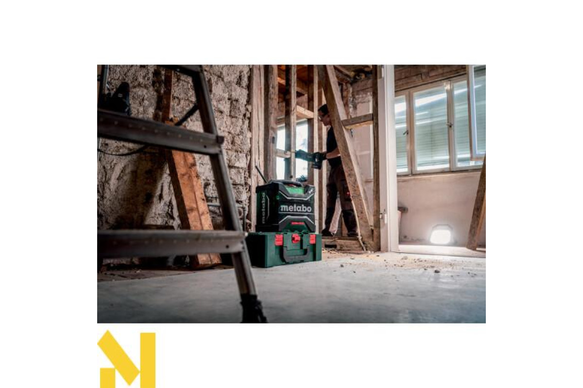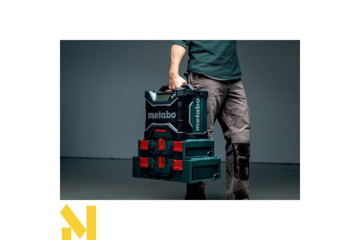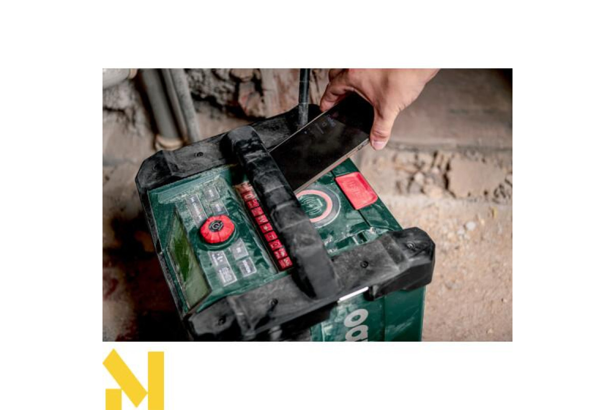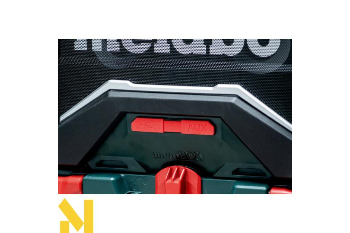 AUX-IN для під'єднання джерел музики за допомогою кабелю • Робота з усіма акумуляторними блоками зі слайдовим кріпленням Metabo від 12 В до 18 В або від електромережі