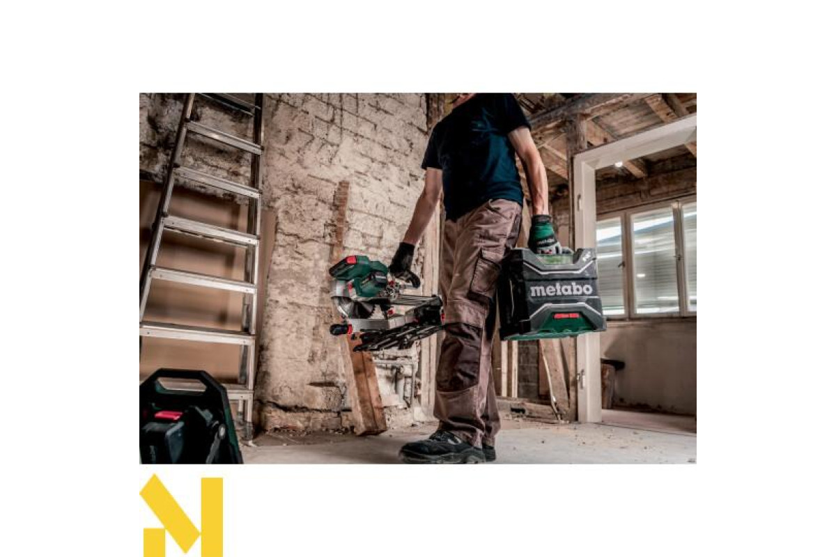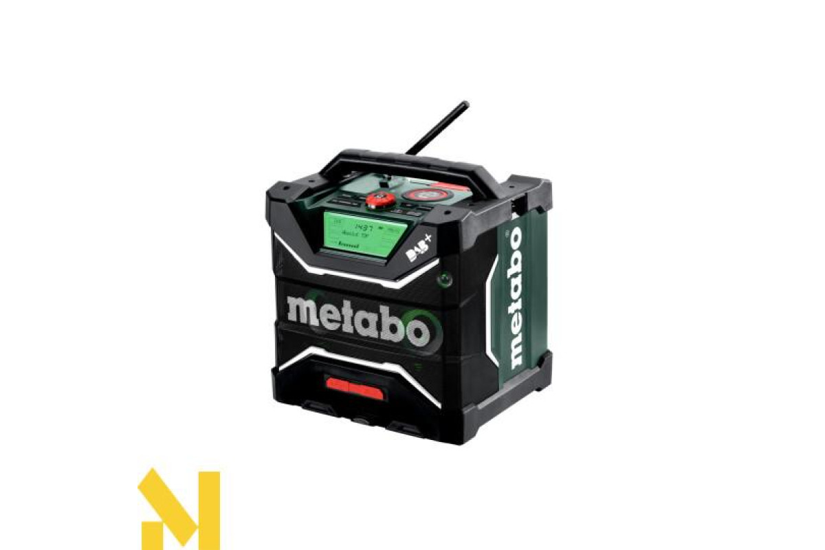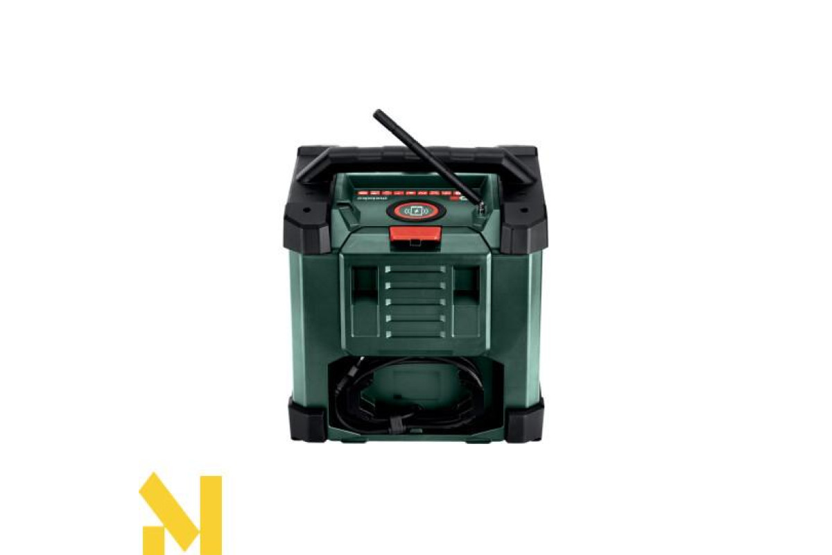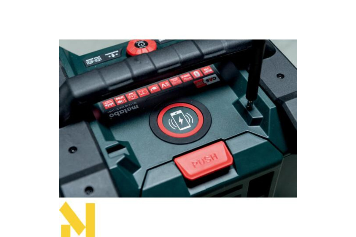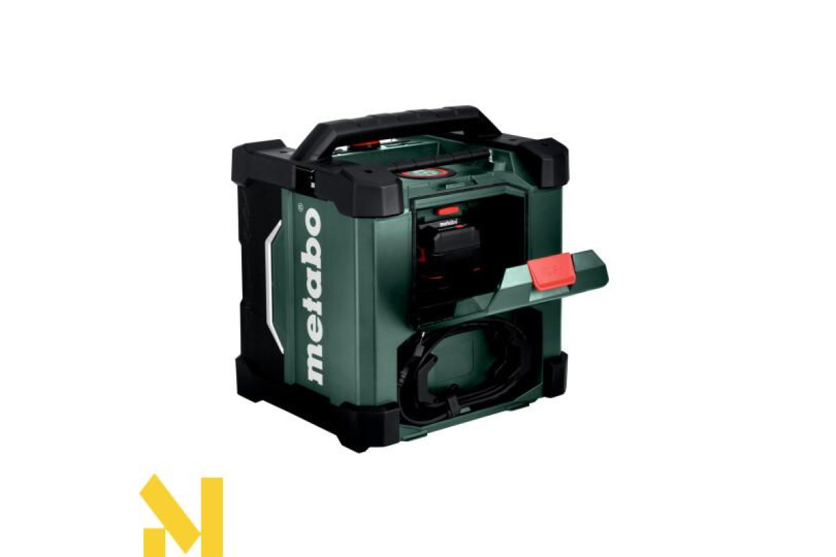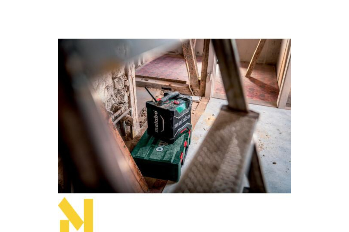 AUX-IN для під'єднання джерел музики за допомогою кабелю • Робота з усіма акумуляторними блоками зі слайдовим кріпленням Metabo від 12 В до 18 В або від електромережі