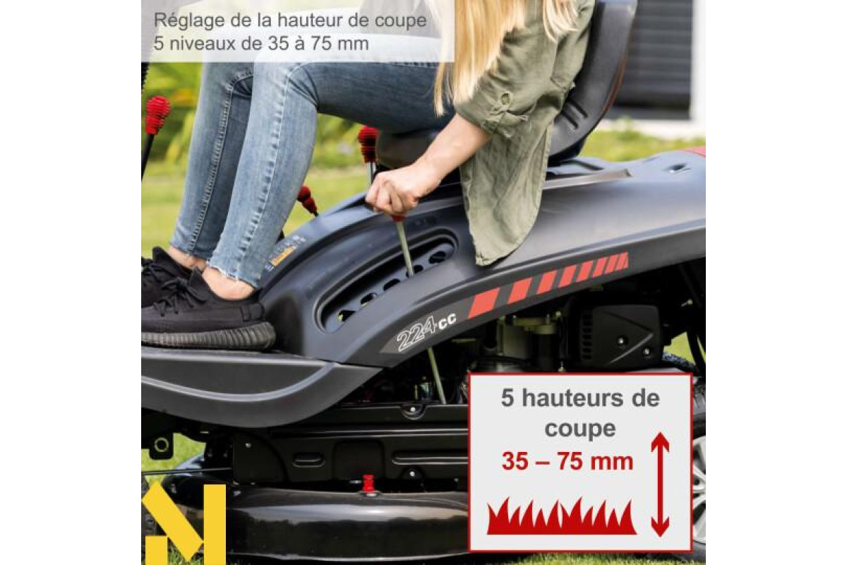 Потужний 4-тактний бензиновий двигун об'ємом 224 см³ і потужністю 5,0 кВт або 6,8 к.с. забезпечує достатню потужність. Вбудований електрозапуск полегшує запуск косарки. За допомогою центрального регулювання висоти зрізу можна однією рукою вибрати одну з 5 висот зрізу від 35 до 75 мм.