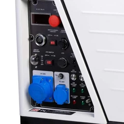 ![]() | Панель управления: интуитивно простая, доступна неопытному пользователю. На нее выведены кнопка запуска генератора, основные индикаторы работы, розетки 2 шт на 16 А и 32 А, предохранитель на розетки, заземление, счетчик моточасов, вольтметр, АВР. |