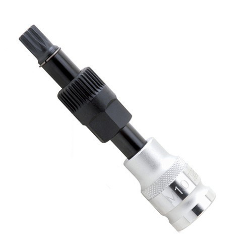 - Этот инструмент позволяет заблокировать генератор переменного тока с помощью вставного гнезда для биты M10 и позволяет ослабить или затянуть болт центрального замка шкива или затянуть зазубренной реактивной гайкой;