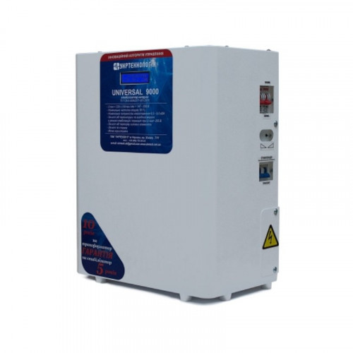 Стабилизатор Укртехнология НСН - 9000 UNIVERSAL (NV) предназначен для стабилизации напряжения питания домашней и офисной техники средней мощности, чувствительной к перепадам напряжения, а также приборов, которые могут заметно изменять свою мощность либо частоту оборотов, в зависимости от колебаний питающего напряжения. Типичные потребители: насосы мощностью до 3-4 кВт, стиральные машины, электрочайники, калориферы. При небольшом количестве потребителей суммарной мощностью до 70% от номинальной мощности стабилизатора, к нему можно подключить небольшой частный дом, дачу или одно- двухкомнатную квартиру. Через данный стабилизатор можно подключить небольшой офис, включая приборы освещения, устройства сигнализации и связи, 3-5 компьютеров, принтер, электрочайник, электрокофеварку.