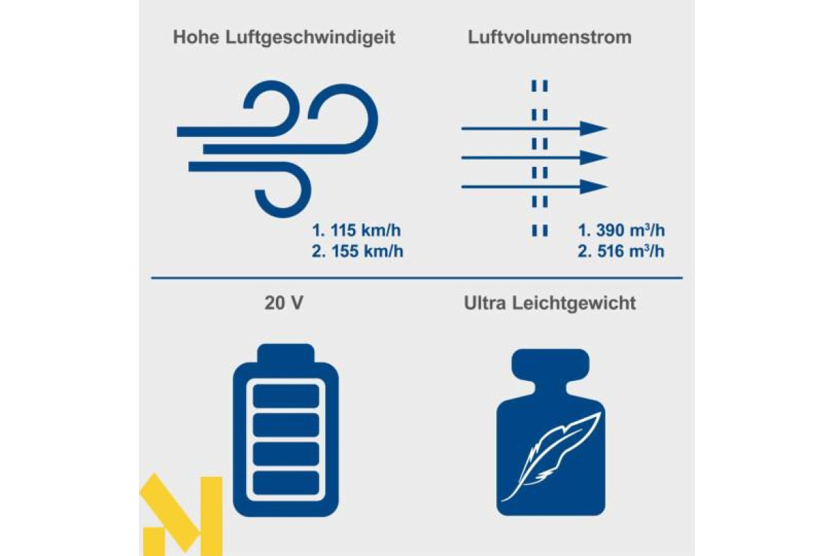 Акумуляторний повітродув Scheppach C-BL700-X ідеально підходить для видування листя, скошеної трави або іншого сміття з під'їзних шляхів, патіо, тротуарів або дворів. Осьовий повітродув забезпечує більшу потужність та оптимальні результати. Висока швидкість повітря до 155 км/год та витрата повітря 516 м³/год забезпечують швидке виконання роботи. Трубка повітродувки є знімною та знімною і кріпиться за допомогою швидкознімного кріплення без інструментів. Як частина серії Scheppach IXES 20-вольт, усі акумулятори та зарядні пристрої системи можна комбінувати з повітродувкою. Акумулятор та зарядний пристрій продаються окремо.