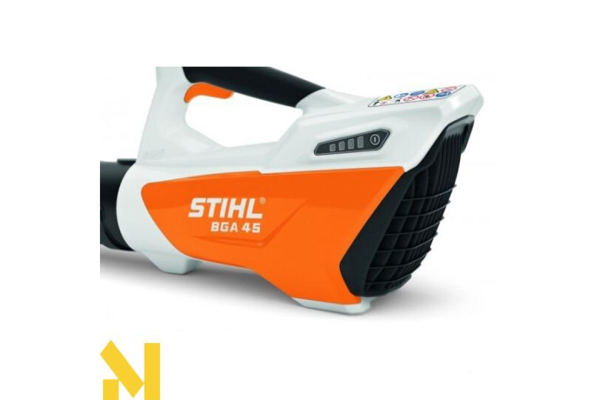 Використання акумуляторного повітродувного пристрою BGA 45 можливо тільки з ключем активації, якщо ключ виймуть, то інструмент знеструмлено для захисту від ненавмисного запуску. Електродвигун повітродувки дозволяє досягти високих швидкостей повітряного потоку. Управління повітродувкою STIHL BGA 45 знаходиться на рукоятці, що дозволяє оператору управляти пристроєм однією рукою. Рукоятка покрита м'яким матеріалом, який забезпечує ергономічність і комфорт під час використання. Для максимально зручного зберігання, повітродувку STIHL BGA 56 можна вішати на стіну. Рівень шуму під час роботи повітродувки помірний до такої міри, що немає необхідності одягати захисні навушники.