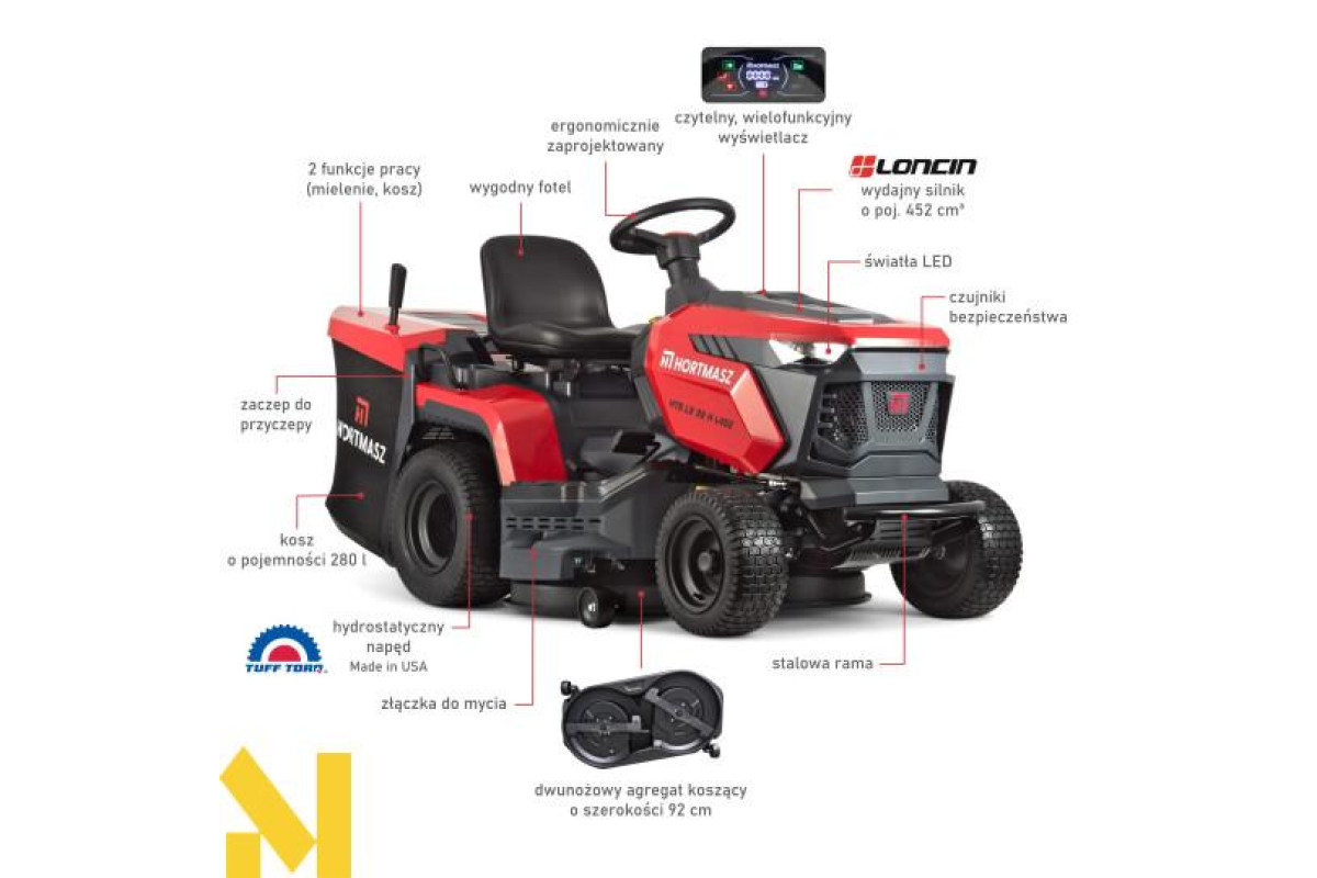 HORTMASZ HTS LX 92 H L452 – це потужний садовий трактор з потужним двигуном Loncin об'ємом 452 см³ та безступінчастою гідростатичною трансмісією TUFF TORQ (США). З шириною зрізу 92 см, двоножевою косаркою та травозбірником об'ємом 280 л ця машина ідеально підходить для великих зелених насаджень. Комфортну роботу забезпечують регульоване сидіння, педалі приводу, багатофункціональний дисплей, світлодіодне освітлення та система датчиків безпеки. Це професійний інструмент для вимогливих користувачів, які цінують потужність, точність та комфорт.