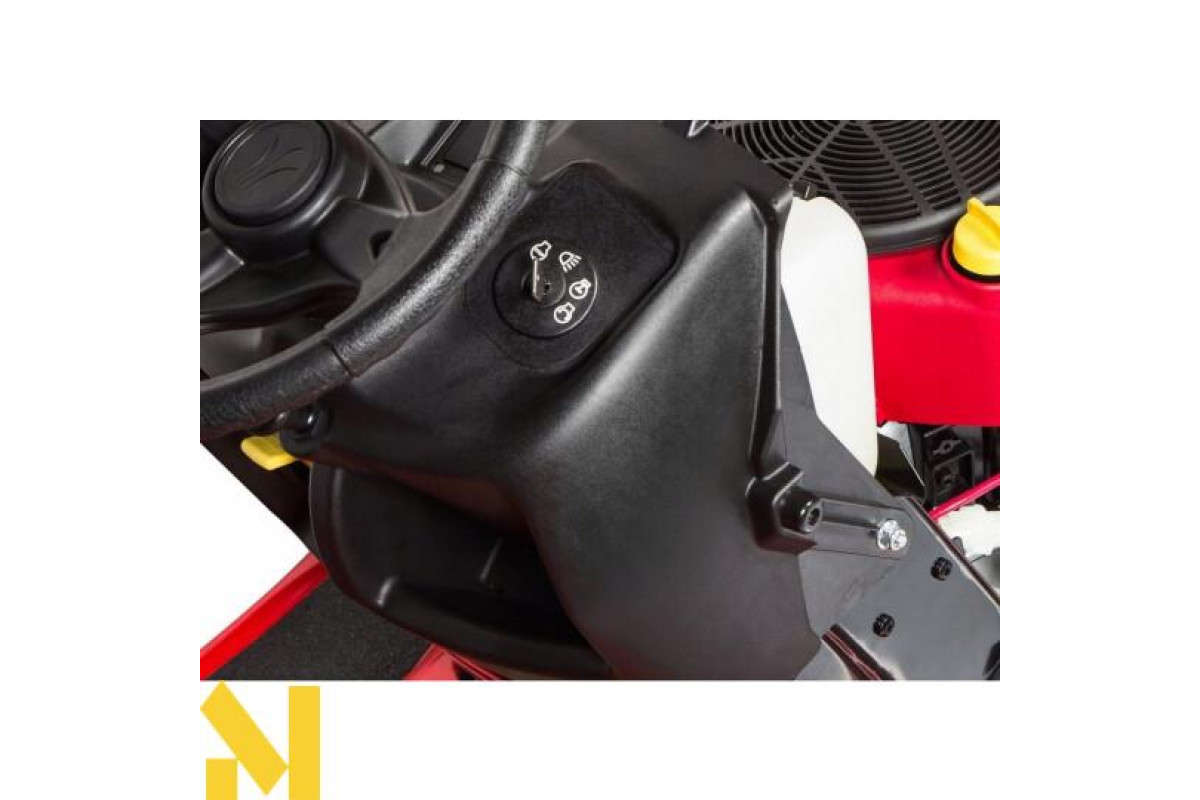 Трактор має зручне сидіння з високою спинкою і запобіжний вимикач, який автоматично відключає двигун і різальний пристрій, якщо користувач залишає сидіння. Приємний на дотик, м'яке кермо забезпечує комфорт при маневруванні пристрою. Передні ліхтарі дозволяють виконувати точну роботу навіть після темряви - ефективне косіння без обмежень. Завжди!