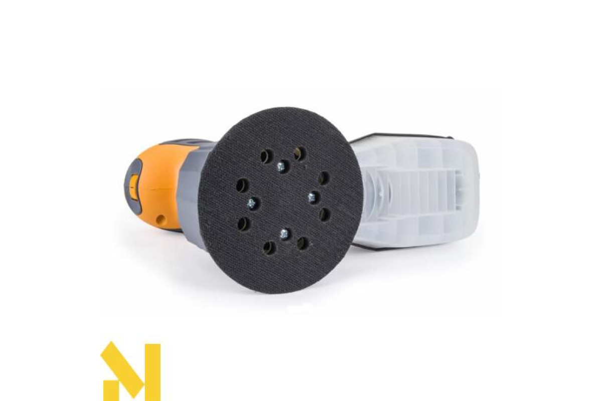 Машина працює з абразивним диском діаметром 125 мм з кріпленням на липучці та вісьмома отворами для відведення пилу.