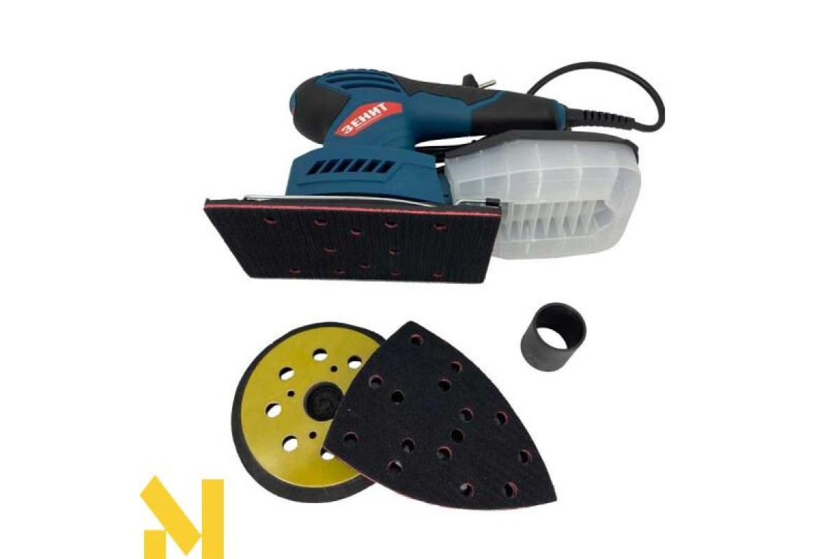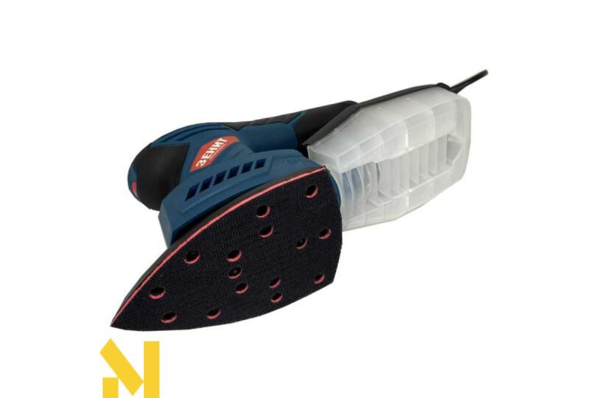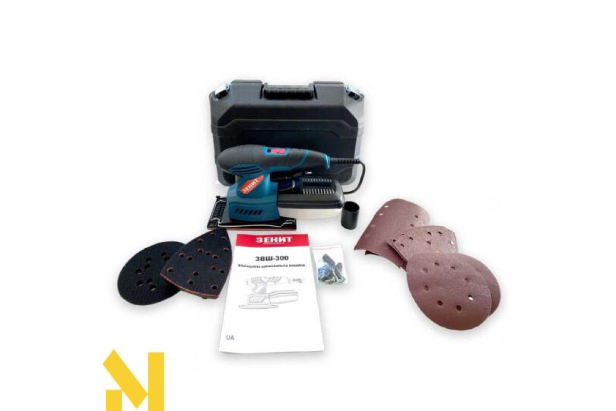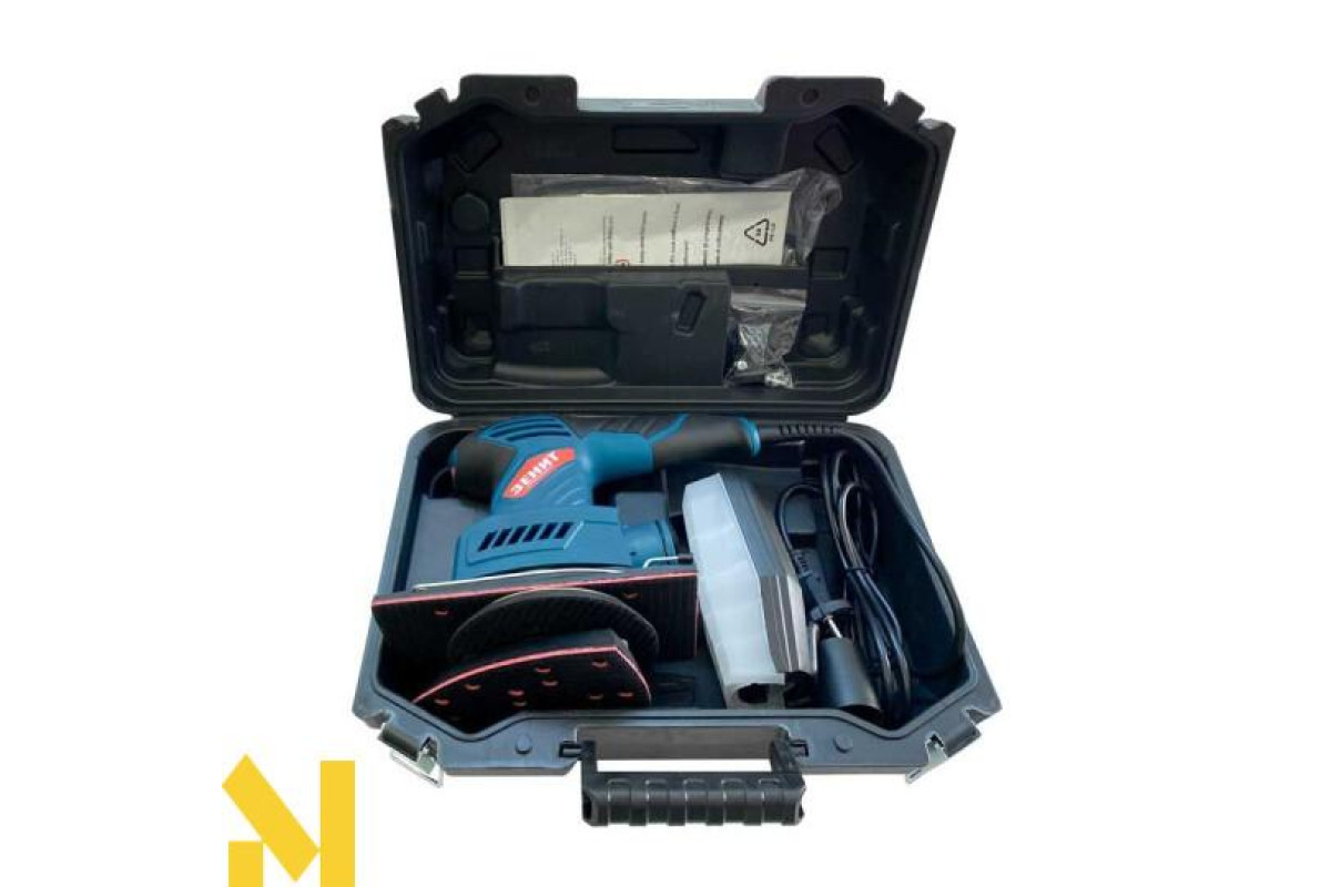 Шліфмашинка поставляється в пластиковому кейсі та в комплекті з контейнером для збору пилу, який легко витрушувати й чистити, а також з трьома типами насадок і набором абразивних листів в комплекті.
