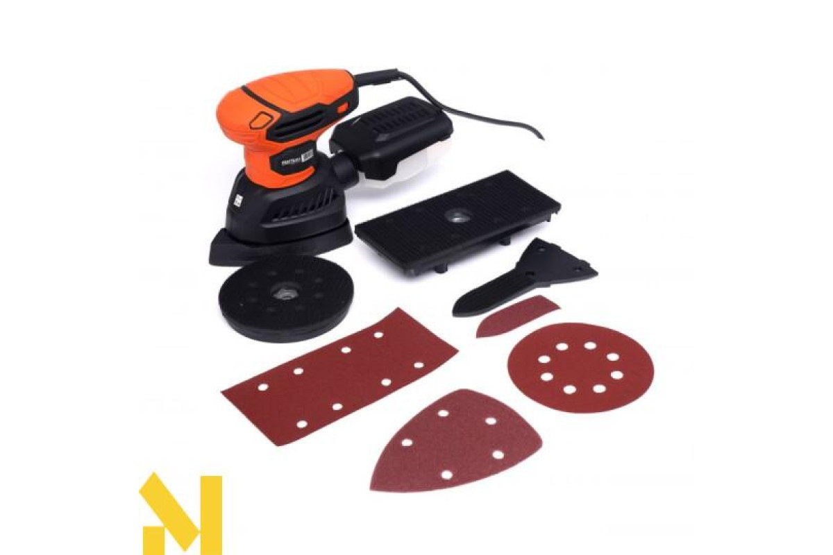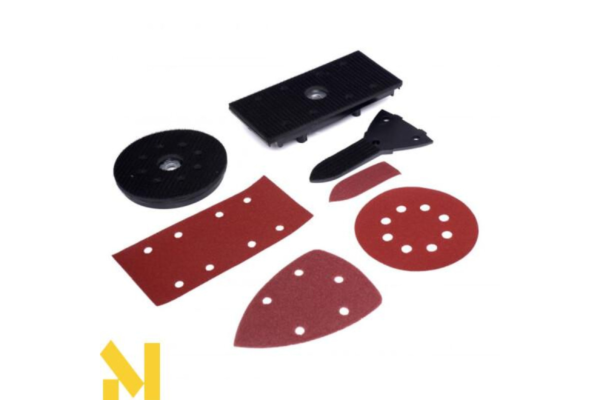 Наждачний папір можна замінити без інструментів, диски кріпляться на липучках. У набір також входить мішок для пилу, щоб ваша робота була чистою.
