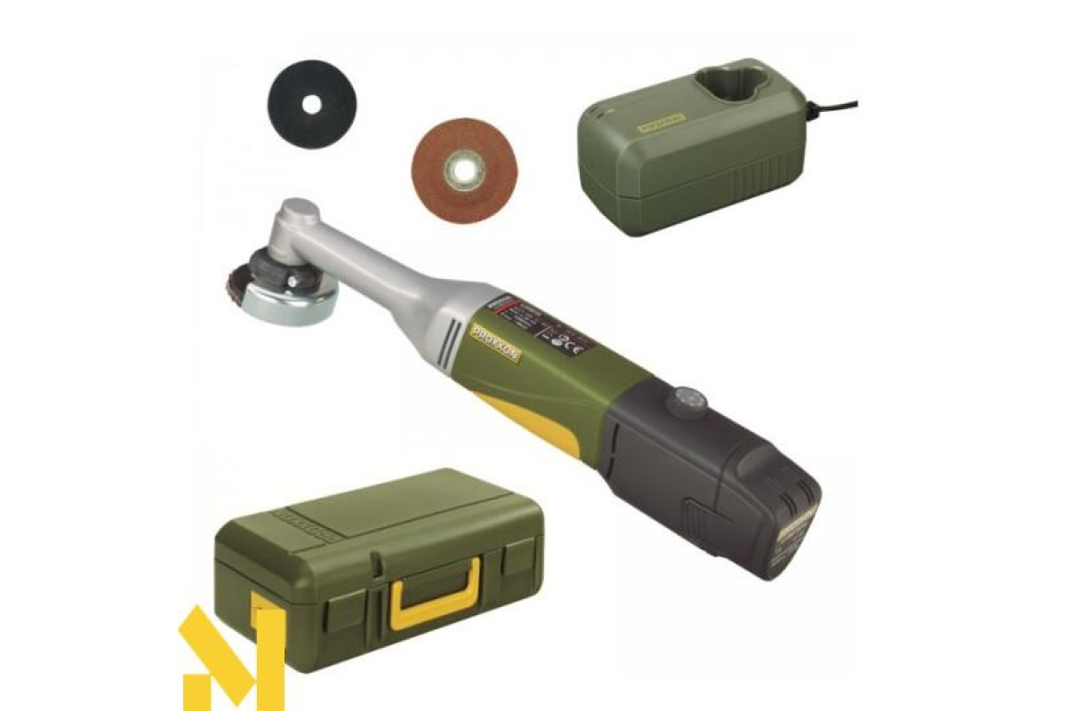 Спеціальна машина для точної шліфування. Використовується для робіт по сталі, кольорових металів, скла, кераміки, дерева і пластику. З електронним регулятором оборотів і зі збереженням високого моменту навіть на низьких швидкостях. Головка виготовлена з литого під тиском алюмінію. Шліфувальний (корунд К60), відрізний і ламельний диск (К100) входять в комплект. Набір включає зарядний пристрій LG / A і високоякісний літій-іон акумулятор (10,8 В / 2,6 Ач). Однієї зарядки акумулятора вистачає на півгодини роботи на максимальній потужності.